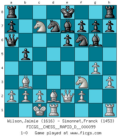 Last move : 1-0 2016 April 21 19:44:49 [Event "FICGS__CHESS__RAPID_D__000099"] [Site "FICGS"] [Date "2016.04.03"] [Round "1"] [White "Wilson,Jaimie"] [Black "Simonnet,Franck"] [Result "1-0"] [WhiteElo "1616"] [BlackElo "1453"] 1.e4 d5 2.exd5 Qxd5 3.Nc3 Qa5 4.d4 Nf6 5.Nf3 Bg4 6.h3 Bf5 7.Bc4 e6 8.Qe2 Be7 9.Bd2 c6 10.O-O-O b5 11.Bb3 Nbd7 12.g4 Bg6 13.d5 cxd5 14.Nxd5 Qa6 15.Nc7+ 1-0 Scandinavian defense, Lasker variation Queenside Castling by player White (move 10) Player White won this chess game. Follow this game move after move (download)I thought the most common mistake [in chess] was the first one: Learning the game :P (Garvin Gray, FICGS forum) Als er Schachweltmeister wurde ließ er praktisch alle stärksten Sovietspieler für sich arbeiten. Wenn ein auch nur mittelmässiger Meister ein Spezialist für eine bestimmte Eröffnung war, wurde er von Karpov gerufen. Das wurde alles geheim gehalten. (Mikhail Moiseyevich Botvinik) Cuando tu casa esta en llamas, no puedes ser molestado por tus vecinos. O, como decinos en Ajedrez, si tu Rey esta bajo ataque, no te preocupa perder un Peón del lado de la Reina. (Gary Kasparov) J'ai vu le vaincu d'Echecs jouer des années durant dans l'espoir de la fête de la victoire. Car tu es plus riche de ce qu'elle existe si même elle n'est point pour toi. Ainsi de la perle du fond des mers. (Antoine de Saint-Exupéry) Establishing goals is all right if you don't let them deprive you of interesting detours. (Doug Larson)
