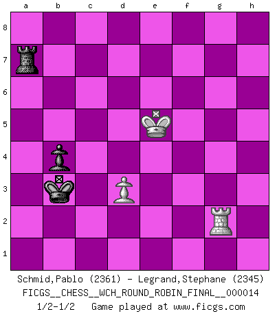 Last move : 1/2-1/2 2017 January 10 18:7:17 [Event "FICGS__CHESS__WCH_ROUND_ROBIN_FINAL__000014"] [Site "FICGS"] [Date "2016.04.03"] [Round "1"] [White "Schmid,Pablo"] [Black "Legrand,Stephane"] [Result "1/2-1/2"] [WhiteElo "2361"] [BlackElo "2345"] 1.e4 c5 2.Nf3 Nc6 3.Bb5 g6 4.Bxc6 dxc6 5.d3 Bg7 6.h3 Nf6 7.Nc3 O-O 8.Be3 b6 9.Qd2 e5 10.Bh6 Qd6 11.Bxg7 Kxg7 12.O-O a5 13.a4 Re8 14.b3 Nh5 15.Ne2 f6 16.Rae1 Ra7 17.g4 Nf4 18.Nxf4 exf4 19.Qc3 Rae7 20.Kg2 h6 21.Rh1 Be6 22.Nd2 Ra8 23.Nc4 Qd8 24.Ra1 Re8 25.Nd2 Qd6 26.Kf3 g5 27.Nc4 Qc7 28.Ke2 b5 29.Nd2 Qb6 30.Rh2 Rh8 31.e5 b4 32.Qb2 Bd5 33.Re1 Rae8 34.Kd1 Qd8 35.f3 Kg6 36.Rhe2 h5 37.exf6 Rxe2 38.Rxe2 Qxf6 39.Qxf6+ Kxf6 40.Ne4+ Bxe4 41.Rxe4 hxg4 42.hxg4 Rh1+ 43.Kd2 Rh3 44.Rc4 Rxf3 45.Rxc5 Rg3 46.Rxc6+ Kf7 47.Ra6 Rxg4 48.Ke2 Rh4 49.Kf3 Rh3+ 50.Kg4 Rg3+ 51.Kh5 Rg2 52.Rxa5 Ke6 53.Ra6+ Ke5 54.Ra5+ Kd4 55.Rf5 Ke3 56.Re5+ Kd2 57.a5 f3 58.a6 Rg1 59.Rf5 Kxc2 60.Rxf3 g4 61.Rf8 g3 62.a7 Rh1+ 63.Kg6 g2 64.Rf2+ Kxb3 65.Rxg2 Ra1 66.Kf6 Rxa7 67.Ke5 1/2-1/2 Sicilian : Nimzovich-Rossolimo attack (with ...g6, without ...d6) Kingside Castling by player Black (move 7) Kingside Castling by player White (move 12) 10 pieces endgame at move 59 : White KRPPP , Black KRPPP WHITE : King + 1 Rook 3 Pawns BLACK : King + 1 Rook 3 Pawns 9 pieces endgame at move 60 : White KRPPP , Black KRPP WHITE : King + 1 Rook 3 Pawns BLACK : King + 1 Rook 2 Pawns 8 pieces endgame at move 64 : White KRPP , Black KRPP WHITE : King + 1 Rook 2 Pawns BLACK : King + 1 Rook 2 Pawns 7 pieces endgame at move 65 : White KRPP , Black KRP WHITE : King + 1 Rook 2 Pawns BLACK : King + 1 Rook 1 Pawn 6 pieces endgame at move 66 : White KRP , Black KRP WHITE : King + 1 Rook 1 Pawn BLACK : King + 1 Rook 1 Pawn This chess game ended in a draw. Follow this game move after move (download)Your body has to be in top condition. Your Chess deteriorates as your body does. You can't separate body from mind. (Bobby Fischer) Ich kenne Menschen, die allen Willen der Welt besitzen und doch nicht Schach spielen können. (Robert James Fischer) El Ajedrez, como la música, como el amor, tiene el poder de hacer feliz a la gente. (Siegbert Tarrasch) Les échecs sont un jeu terrible. Si vous n'avez pas le centre, votre adversaire a une position plus libre. Par contre, si vous avez le centre, alors vous avez vraiment quelque chose pour laquelle vous inquiéter ! (Siegbert Tarrasch) Animated gif is worth one mega-word. (Unknown)