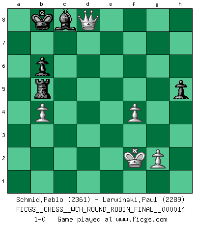 Last move : 1-0 2016 November 14 16:30:17 [Event "FICGS__CHESS__WCH_ROUND_ROBIN_FINAL__000014"] [Site "FICGS"] [Date "2016.04.03"] [Round "1"] [White "Schmid,Pablo"] [Black "Larwinski,Paul"] [Result "1-0"] [WhiteElo "2361"] [BlackElo "2289"] 1.e4 e5 2.Nf3 Nc6 3.d4 exd4 4.Bc4 Bc5 5.c3 Nf6 6.cxd4 Bb4+ 7.Nbd2 Nxe4 8.d5 Nxd2 9.Bxd2 Bxd2+ 10.Qxd2 Ne7 11.d6 cxd6 12.O-O d5 13.Bxd5 Nxd5 14.Rfe1+ Ne7 15.Rxe7+ Qxe7 16.Re1 h6 17.Qd6 Qxe1+ 18.Nxe1 a5 19.Nd3 f6 20.Nf4 Ra6 21.Qd5 Rf8 22.h4 g5 23.Qe4+ Kd8 24.Nd5 Re8 25.Qg6 Rd6 26.Qf7 gxh4 27.Kh2 f5 28.Qxf5 b6 29.Qf7 Bb7 30.Nc7 Kxc7 31.Qxe8 Rd5 32.Qe4 h5 33.Qf4+ d6 34.Qf7+ Kc6 35.Qe8+ Kc7 36.Qe7+ Kc6 37.Qxh4 Kd7 38.Qh3+ Kc7 39.Qe6 Rd2 40.Qe1 Rd5 41.Qe7+ Kc6 42.Qf7 Rc5 43.Qe8+ Kc7 44.Qe7+ Kc6 45.Qd8 Rc2 46.Qe8+ Kc7 47.Qe7+ Kb8 48.Qxd6+ Ka7 49.Qd4 Rc5 50.f4 Bc8 51.a3 Kb7 52.b4 Rf5 53.Qd6 axb4 54.axb4 Rb5 55.Qd8 Rf5 56.Kg3 Rb5 57.Kf2 Bg4 58.Qd4 Bf5 59.Qg7+ Kb8 60.Qh8+ Bc8 61.Qd8 1-0 This chess game has been lost on time (started : 2016.04.03 22:45:24) Scotch gambit Kingside Castling by player White (move 12) 10 pieces endgame at move 54 : White KQPPP , Black KRBPP WHITE : King + 1 Queen 3 Pawns BLACK : King + 1 Rook 1 Bishop 2 Pawns Player White won this chess game. Follow this game move after move (download)Later, I began to succeed in decisive games. Perhaps because I realized a very simple truth: not only was I worried, but also my opponent. (Mikhail Tal) Wenn Schach ein enormer Dschungel ist, der seine Myriaden von Geheimnissen nicht preisgeben will, dann sind Computer die Kettensägen einer gewaltigen ökologisch unsensiblen Nutzholzfirma. (Nigel Short) Aquellos que dicen entender al Ajedrez, no entienden nada. (Robert Hubner) Si je n'étais pas joueur d'échecs, je serais le meilleur dans quelque chose d'autre. (Anatoli Karpov) The message for business people contemplating their place in the cyberspace is simple and direct: get linked or get lost. (Vic Sussman and Kenan Pollack)