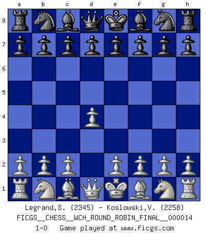 Last move : 1-0 2016 June 15 10:53:2 [Event "FICGS__CHESS__WCH_ROUND_ROBIN_FINAL__000014"] [Site "FICGS"] [Date "2016.04.03"] [Round "1"] [White "Legrand,Stephane"] [Black "Koslowski,Volker"] [Result "1-0"] [WhiteElo "2345"] [BlackElo "2258"] 1.d4 1-0 This chess game has been lost on time (started : 2016.04.03 22:45:24) Queen's pawn Player White won this chess game. Follow this game move after move (download)Chess is a terrible game. If you have no center, your opponent has a freer position. If you do have a center, then you really have something to worry about ! (Siegbert Tarrasch) Ich würde die 30 stärksten Spieler der USA im Simultanspiel besiegen. (José Raúl Capablanca) Vive, pierde y aprende al observar a tu oponente como ganar. (Amber Steenbock) D'abord les bases : Jouez et étudiez, puis étudiez et jouez, ensuite jouez et étudiez, puis étudiez et jouez. Deuxièmement : Donnez toujours le meilleur de vous-même ! (Ken Smith) Political correctness is subjecting us to gross incompetence. (Johann Piek)