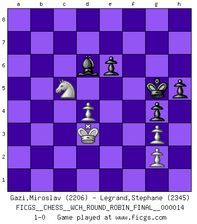 Last move : 1-0 2017 January 26 3:6:24 [Event "FICGS__CHESS__WCH_ROUND_ROBIN_FINAL__000014"] [Site "FICGS"] [Date "2016.04.03"] [Round "1"] [White "Gazi,Miroslav"] [Black "Legrand,Stephane"] [Result "1-0"] [WhiteElo "2206"] [BlackElo "2345"] 1.d4 Nf6 2.Bg5 d5 3.Nd2 c5 4.e3 Nc6 5.c3 cxd4 6.exd4 h6 7.Bf4 Bf5 8.Qb3 Qc8 9.Ne2 e6 10.Nc1 Nh5 11.Bg3 Nxg3 12.hxg3 Bd6 13.Bd3 Bxd3 14.Nxd3 O-O 15.O-O a6 16.a4 Qc7 17.Qd1 Rad8 18.Re1 g6 19.b4 Rfe8 20.Qb3 b6 21.Nf3 h5 22.Rec1 Qb7 23.c4 dxc4 24.Rxc4 Ra8 25.Rac1 Ne7 26.b5 axb5 27.Qxb5 Qd5 28.Qb1 Reb8 29.Nb4 Qf5 30.Nc6 Qxb1 31.Nxe7+ Bxe7 32.Rxb1 Ra6 33.Kf1 Rba8 34.Ke2 Rxa4 35.Rxa4 Rxa4 36.Rxb6 Ra5 37.Ne1 Ra2+ 38.Kf3 Kg7 39.Nd3 Bf6 40.Ke3 Ra4 41.Rb4 Ra5 42.Rb7 Rd5 43.Rb4 g5 44.Ne1 Kg6 45.Kd3 Bd8 46.Nc2 Rf5 47.Ke3 Ra5 48.Rc4 Rb5 49.Rb4 Rd5 50.Kd3 Be7 51.Rc4 Rf5 52.Ke2 g4 53.Rc7 Bf8 54.Rc8 Kg7 55.Ne3 Ra5 56.Kd3 Be7 57.Ke4 f5+ 58.Kd3 Ra3+ 59.Rc3 Rxc3+ 60.Kxc3 Kf6 61.Nc4 Kg5 62.Ne5 f4 63.Kd3 fxg3 64.fxg3 Bb4 65.Nd7 Bd6 66.Nc5 1-0 Ramil Germanes why did black resign? Stephane Legrand lost on time... Trompowsky attack (Ruth, Opovcensky Opening) Kingside Castling by player Black (move 14) Kingside Castling by player White (move 15) 10 pieces endgame at move 64 : White KNPPP , Black KBPPP WHITE : King + 1 Knight 3 Pawns BLACK : King + 1 Bishop 3 Pawns Player White won this chess game. Follow this game move after move (download)Chess books should be used as we use glasses: to assist the sight, although some players make use of them as if they thought they conferred sight. (Jose Raul Capablanca) Schach ist wie eine schöne Frau, zu der wir ständig zurückkehren, gleichviel, wie oft sie uns zurückweist. (Anonymous) Tu no necesitas jugar muy bien, únicamente ayudar a tu oponenet a que juegue muy mal. (Genrikh Chepukaitis) Les Echecs sont et restent toujours un combat, un combat intégral comme la boxe, la lutte ou un autre sport, et où il doit y avoir un vainqueur et un vaincu. (Joseph Emil Diemer) He who laughs last probably does not get the joke. (Unknown)