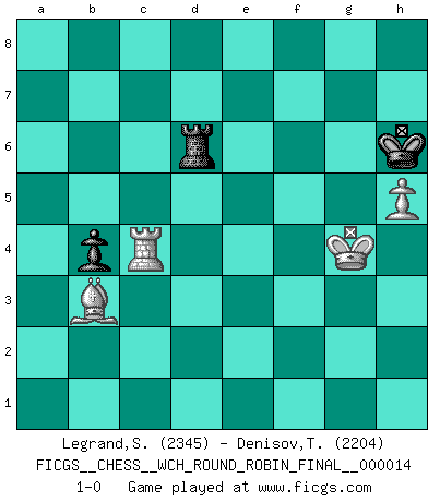 Last move : 1-0 2016 December 17 22:49:9 [Event "FICGS__CHESS__WCH_ROUND_ROBIN_FINAL__000014"] [Site "FICGS"] [Date "2016.04.03"] [Round "1"] [White "Legrand,Stephane"] [Black "Denisov,Timofey"] [Result "1-0"] [WhiteElo "2345"] [BlackElo "2204"] 1.d4 Nf6 2.c4 g6 3.Nc3 Bg7 4.e4 d6 5.Be2 O-O 6.Be3 e5 7.d5 Na6 8.Nf3 Ng4 9.Bg5 f6 10.Bh4 Qe8 11.a3 f5 12.b4 Bf6 13.h3 Bxh4 14.Nxh4 Nxf2 15.Kxf2 fxe4 16.Kg1 g5 17.Bh5 Qd8 18.Ng6 hxg6 19.Bxg6 Qf6 20.Bxe4 g4 21.Ra2 Qg5 22.Qd2 Qxd2 23.Rxd2 gxh3 24.gxh3 Bd7 25.Rg2+ Kh8 26.c5 dxc5 27.b5 Nb4 28.Kh2 Rf6 29.Rc1 Rh6 30.Rg3 a5 31.Na4 Bxb5 32.Nxc5 Na6 33.Nxa6 Bxa6 34.Rxc7 b5 35.d6 Rd8 36.d7 b4 37.axb4 axb4 38.Bf5 Rd6 39.Rc5 Rd2+ 40.Kg1 Rd1+ 41.Kg2 Bb7+ 42.Kf2 Rf8 43.Ke2 Rd5 44.Rxd5 Bxd5 45.Rg6 Bc4+ 46.Ke3 Bb5 47.Rb6 Bxd7 48.Bxd7 Rf4 49.Rb5 Kg7 50.Rxe5 Rf7 51.Ba4 Rb7 52.Bb3 Rc7 53.Kf4 Rc3 54.Be6 Kf6 55.Re4 Rc5 56.Bd7 Rc7 57.Ba4 Rb7 58.Bb3 Rh7 59.Kg4 Rg7+ 60.Kf3 Rb7 61.h4 Kf5 62.Rc4 Rb6 63.Rc5+ Kg6 64.h5+ Kh6 65.Kg4 Rd6 66.Rc4 1-0 King's Indian : Semi-Averbakh system Kingside Castling by player Black (move 5) 10 pieces endgame at move 44 : White KRBPP , Black KRBPP WHITE : King + 1 Rook 1 Bishop 2 Pawns BLACK : King + 1 Rook 1 Bishop 2 Pawns 9 pieces endgame at move 47 : White KRBP , Black KRBPP WHITE : King + 1 Rook 1 Bishop 1 Pawn BLACK : King + 1 Rook 1 Bishop 2 Pawns 8 pieces endgame at move 48 : White KRBP , Black KRPP WHITE : King + 1 Rook 1 Bishop 1 Pawn BLACK : King + 1 Rook 2 Pawns 7 pieces endgame at move 50 : White KRBP , Black KRP WHITE : King + 1 Rook 1 Bishop 1 Pawn BLACK : King + 1 Rook 1 Pawn Player White won this chess game. Follow this game move after move (download)The mistakes are there, waiting to be made. (Savielly Tartakower) Es genügt nicht ein guter Spieler zu sein, man muß auch gut spielen. (Siegbert Tarrasch) En la vida, como en el Ajedrez, los Peones propios obstruyen nuestro camino. La gran fortuna de un hombre, su comodidad, placer, hijos, libros, que deberían ayudarle a ganar, con mucha frecuencia lo ponen en Jaque Mate. (Charles Buxton) Les échecs, c'est l'art d'analyser. (Mikhail Botvinnik) Life is like a ten-speed bicycle: most of us have gears we never use. (Charles M. Schulz)