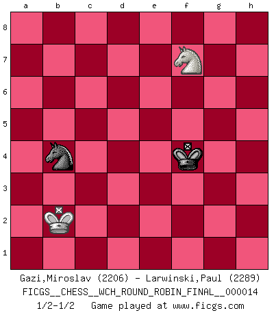 Last move : 1/2-1/2 2016 November 2 22:6:53 [Event "FICGS__CHESS__WCH_ROUND_ROBIN_FINAL__000014"] [Site "FICGS"] [Date "2016.04.03"] [Round "1"] [White "Gazi,Miroslav"] [Black "Larwinski,Paul"] [Result "1/2-1/2"] [WhiteElo "2206"] [BlackElo "2289"] 1.d4 Nf6 2.Bg5 d5 3.Nd2 c5 4.e3 cxd4 5.exd4 Qb6 6.Nb3 Bg4 7.Be2 Bxe2 8.Nxe2 Nbd7 9.O-O e6 10.a4 Bd6 11.Bf4 O-O 12.Re1 Rfe8 13.a5 Qc7 14.Bxd6 Qxd6 15.c3 a6 16.Ng3 Qc7 17.Qd2 Qc4 18.Nc1 e5 19.Nce2 Ne4 20.Nxe4 dxe4 21.Ng3 exd4 22.Rxe4 Rxe4 23.Nxe4 dxc3 24.Nxc3 Nf6 25.Ra4 Qc5 26.h3 Rc8 27.Qd4 h6 28.Kh2 Qxd4 29.Rxd4 Rc5 30.Rb4 Rxa5 31.Rxb7 Rf5 32.f3 Nd5 33.Ne4 Nf4 34.Rb8+ Kh7 35.g4 Rb5 36.Rxb5 axb5 37.Nd6 b4 38.Nxf7 Nd3 39.b3 Nc5 40.Ne5 Nxb3 41.Nd3 Nd4 42.f4 Ne2 43.f5 b3 44.Nb2 g6 45.fxg6+ Kxg6 46.Kg2 Kg5 47.Kf3 Nc3 48.Kg3 Ne4+ 49.Kf3 Nc3 50.Ke3 Kh4 51.Kd3 Na2 52.Nc4 Kxh3 53.Ne5 Kg3 54.Nf7 Kxg4 55.Nxh6+ Kf4 56.Nf7 b2 57.Kc2 b1Q+ 58.Kxb1 Nb4 59.Kb2 1/2-1/2 Trompowsky attack (Ruth, Opovcensky Opening) Kingside Castling by player White (move 9) Kingside Castling by player Black (move 11) 10 pieces endgame at move 40 : White KNPPP , Black KNPPP WHITE : King + 1 Knight 3 Pawns BLACK : King + 1 Knight 3 Pawns 9 pieces endgame at move 45 : White KNPPP , Black KNPP WHITE : King + 1 Knight 3 Pawns BLACK : King + 1 Knight 2 Pawns 8 pieces endgame at move 45 : White KNPP , Black KNPP WHITE : King + 1 Knight 2 Pawns BLACK : King + 1 Knight 2 Pawns 7 pieces endgame at move 52 : White KNP , Black KNPP WHITE : King + 1 Knight 1 Pawn BLACK : King + 1 Knight 2 Pawns 6 pieces endgame at move 54 : White KN , Black KNPP WHITE : King + 1 Knight BLACK : King + 1 Knight 2 Pawns 5 pieces endgame at move 55 : White KN , Black KNP WHITE : King + 1 Knight BLACK : King + 1 Knight 1 Pawn Promotion Queen by player Black (move 57) 4 pieces endgame at move 58 : White KN , Black KN WHITE : King + 1 Knight BLACK : King + 1 Knight This chess game ended in a draw. Follow this game move after move (download)There are two types of sacrifices: correct ones and mine. (Mikhail Tal) Schach verlangt totale Konzentration. (Robert James Fischer) En un gambito tu regalas un Peón por el bién de tomar un juego perdido. (Samuel Standige Boden) Le jeu d'échecs fait naître et fortifie en nous plusieurs qualités précieuses dans le cours de l'existence, telles que la prévoyance, la circonspection, la prudence, et la persévérance. (Benjamin Franklin - 1783, la morale des échecs) The ultimate in disposing one's troops is to be without ascertainable shape. Then the most penetrating spies cannot pry in nor can the wise lay plans against you. (Sun Tzu)