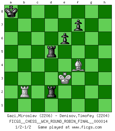 Last move : 1/2-1/2 2017 March 5 13:18:16 [Event "FICGS__CHESS__WCH_ROUND_ROBIN_FINAL__000014"] [Site "FICGS"] [Date "2016.04.03"] [Round "1"] [White "Gazi,Miroslav"] [Black "Denisov,Timofey"] [Result "1/2-1/2"] [WhiteElo "2206"] [BlackElo "2204"] 1.d4 d5 2.c4 c6 3.Nf3 Nf6 4.Nc3 e6 5.Bg5 h6 6.Bh4 dxc4 7.e4 g5 8.Bg3 b5 9.Be2 Bb7 10.h4 Rg8 11.hxg5 hxg5 12.e5 Nd5 13.Ne4 Nd7 14.Rh5 Be7 15.a4 g4 16.Nh2 c5 17.Nxg4 Qb6 18.a5 Qa6 19.b3 cxb3 20.Qxb3 c4 21.Qb1 O-O-O 22.Bh4 Bb4+ 23.Kf1 Rdf8 24.Nh6 Rg6 25.Bf3 Kb8 26.Ra2 Ka8 27.Bg5 Rg7 28.Nf6 Nc3 29.Qxb4 Nxa2 30.Qe7 Bxf3 31.Nxd7 Bxg2+ 32.Kxg2 Rc8 33.Nc5 Qc6+ 34.f3 Nb4 35.Ng4 Nd5 36.Qd6 Nf4+ 37.Bxf4 Rxg4+ 38.Bg3 R4g8 39.Qxc6+ Rxc6 40.Rh1 b4 41.Kf2 R6c8 42.Bf4 Rgd8 43.Ne4 Rb8 44.Ke3 b3 45.a6 Rh8 46.Rg1 Rhg8 47.Bg5 Rb6 48.Kd2 Rxa6 49.Kc3 Ra4 50.Rd1 a5 51.Rb1 Rh8 52.Nc5 Rb4 53.Na6 Rb6 54.Nc5 Rh3 55.Kxc4 Rb4+ 56.Kd3 Rxf3+ 57.Ke4 Rh3 58.Bd2 Rb5 59.Rb2 Ka7 60.Be3 Rb8 61.Kd3 Ka8 62.Ke4 Rg3 63.Kf4 Rh3 64.Bd2 Rg8 65.Rb1 Rg2 66.Bxa5 b2 67.Ne4 Re2 68.Nd2 Ra3 69.Bb4 Rd3 70.Rxb2 Rxd4+ 71.Kf3 Rxe5 72.Be7 Rd3+ 73.Kf2 Rf5+ 74.Ke2 Rg3 75.Bd6 Rg2+ 76.Ke3 Rd5 77.Bf4 Rgxd2 1/2-1/2 QGD Slav : 4.Nc3 Queenside Castling by player Black (move 21) 10 pieces endgame at move 70 : White KRBNP , Black KRRPP WHITE : King + 1 Rook 1 Bishop 1 Knight 1 Pawn BLACK : King + 2 Rooks 2 Pawns 9 pieces endgame at move 71 : White KRBN , Black KRRPP WHITE : King + 1 Rook 1 Bishop 1 Knight BLACK : King + 2 Rooks 2 Pawns 8 pieces endgame at move 77 : White KRB , Black KRRPP WHITE : King + 1 Rook 1 Bishop BLACK : King + 2 Rooks 2 Pawns This chess game ended in a draw. Follow this game move after move (download)You know you're going to lose. Even when I was ahead I knew I was going to lose. - On playing against Fischer. (Andrew Soltis) Karpov ist ein Museumsstück. (Garry Kasparov) ¡Examina movidas que hagan daño! Un buen ojo for movidas desvastantes es mucho mas importante que el conocimiento de principios estratégicos. (Purdy) Echiquier : carré parfait, comme la Jérusalem nouvelle décrite par l'auteur de l'Apocalypse, huit cases sur huit, exaltation du chiffre 4, symbole du cosmos aux quatre horizons... où le noir et le blanc, l'ombre et la lumière, le mal et le bien s'entremêlent et se conjuguent. (Robert Couffignal, Le Gambit du poète) If only people were all showed a certain minimum level of niceness; if only people didn't retract verbal draw offers (without draw box ticked) on ficgs; if only people didn't kill; if only people didn't run concentration / extermination camps, if only people didn't drop nuclear bombs on Hiroshima and Nagasaki, and so on - it would be a much more beautiful world. But sadly, things are not so... (Normajean Yates)