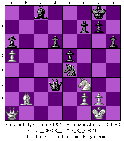 Last move : 0-1 2016 June 13 14:46:24 [Event "FICGS__CHESS__CLASS_B__000240"] [Site "FICGS"] [Date "2016.04.04"] [Round "1"] [White "Sorcinelli,Andrea"] [Black "Romano,Jacopo"] [Result "0-1"] [WhiteElo "1921"] [BlackElo "1800"] 1.e4 e5 2.Nf3 Nc6 3.Bb5 Nf6 4.d3 Bc5 5.O-O d6 6.c3 O-O 7.Nbd2 a6 8.Bxc6 bxc6 9.Re1 Re8 10.b4 Bb6 11.Nc4 Be6 12.a4 c5 13.Nxb6 cxb6 14.h3 h6 15.Bd2 cxb4 16.cxb4 Rc8 17.Rc1 Qd7 18.Be3 Rxc1 19.Bxc1 Qc6 20.Bb2 Bd7 21.a5 Qb5 22.Bc3 Rc8 23.Qa1 bxa5 24.bxa5 Qxd3 25.Rc1 Nxe4 26.Bb2 Bxh3 27.Rxc8+ Bxc8 0-1 Ruy Lopez : Berlin defense Kingside Castling by player White (move 5) Kingside Castling by player Black (move 6) Player Black won this chess game. Follow this game move after move (download)The passed pawn is a criminal, who should be kept under lock and key. Mild measures, such as police surveillance, are not sufficient. (Nimzovitch) Ich hatte meine größten Erfolge, als ich 47 Jahre alt war. Kasparow war noch nicht mal 42 und hat das Schach schon im Stich gelassen. (Viktor Kortschnoi) No existe un remordimiento como el remordimiento del Ajedrez. (H. G. Wells) Les ravages du H expliquent la différence de niveau entre Tal et Thal [Abergel]. Art is the triumph over chaos. (John Cheever)