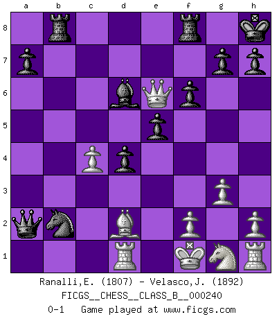 Last move : 0-1 2016 April 11 6:44:5 [Event "FICGS__CHESS__CLASS_B__000240"] [Site "FICGS"] [Date "2016.04.04"] [Round "1"] [White "Ranalli,Emmanuel Eduardo"] [Black "Velasco,Jose Maria"] [Result "0-1"] [WhiteElo "1807"] [BlackElo "1892"] 1.c4 c5 2.Nc3 Nf6 3.g3 e6 4.Bg2 d5 5.d3 d4 6.Ne4 Nxe4 7.Bxe4 Bd6 8.e3 O-O 9.exd4 cxd4 10.Qf3 Nd7 11.Bxb7 Ne5 12.Qg2 Nxd3+ 13.Kf1 Qa5 14.Bf4 Bxb7 15.Qxb7 e5 16.Bg5 f6 17.Rd1 Rab8 18.Qd7 Nxb2 19.Qe6+ Kh8 20.Bd2 Qxa2 0-1 English : Symmetrical variation Kingside Castling by player Black (move 8) Player Black won this chess game. Follow this game move after move (download)White lost because he failed to remember the right continuation and had to think up the moves himself. (Siegbert Tarrasch) Der beste Spieler in einem Turnier gewinnt es nie. Er landet auf Platz zwei oder drei. (Siegbert Tarrasch) Un buen sacrificio es aquel que aunque no sea necesariamente sólido, deja a tu oponente aturdido y confuso. (Rudolph Spielmann) Vous m'avez demandé de vous exposer quel est le fondement de la prière. Je ne fais que préparer les pièces du jeu sur la table... Nous sera-t-il permis d'en adopter les règles et si nous les appliquons scrupuleusement nous ne tarderons pas à faire mat le Roi divin ! Il ne pourra échapper à nos mains. (Sainte Thérèse d'Avila, Chemin de perfection) All the biggest technological inventions created by man - the airplane, the automobile, the computer - says little about his intelligence, but speaks volumes about his laziness. (Mark Kennedy)