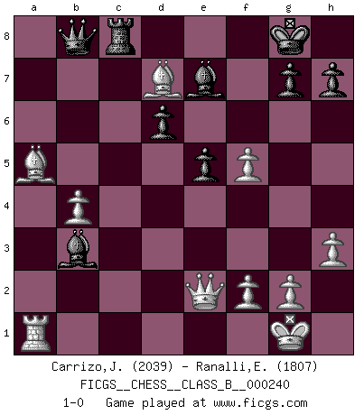 Last move : 1-0 2016 June 26 1:25:38 [Event "FICGS__CHESS__CLASS_B__000240"] [Site "FICGS"] [Date "2016.04.04"] [Round "1"] [White "Carrizo,Jose"] [Black "Ranalli,Emmanuel Eduardo"] [Result "1-0"] [WhiteElo "2039"] [BlackElo "1807"] 1.e4 e5 2.Nf3 Nc6 3.Bb5 a6 4.Ba4 Nf6 5.O-O Be7 6.Re1 b5 7.Bb3 d6 8.c3 O-O 9.h3 Na5 10.Bc2 c5 11.d4 Qc7 12.Nbd2 cxd4 13.cxd4 Bb7 14.d5 Rac8 15.Bd3 Nc4 16.a4 Ra8 17.Qe2 Rfc8 18.axb5 axb5 19.Rxa8 Bxa8 20.b3 Nxd2 21.Bxd2 b4 22.Ra1 Nd7 23.Bxb4 Qb6 24.Bb5 Nc5 25.Ba5 Qb8 26.Nd2 f5 27.exf5 Bxd5 28.b4 Nb3 29.Nxb3 Bxb3 30.Bd7 1-0 Ruy Lopez : Closed Kingside Castling by player White (move 5) Kingside Castling by player Black (move 8) Player White won this chess game. Follow this game move after move (download)All that matters on the Chessboard is good moves. (Bobby Fischer) Je mehr ich von der FIDE weiss, um so weniger verstehe ich. (Alexander Kalifman) Mi estilo es algo parecido entre un poco de Tal y Petrosian. (Reshevsky) Les écrivains ont utilisé les échecs pour analyser les côtés extrêmes de la nature humaine. Dans ce cadre, les échecs offrent un champ d'expérimentation idéal. Mais on pourrait faire la même chose avec la peinture. Et là, en vous référant à Van Gogh, vous ne tirerez pas de conclusion définitive sur les peintres. (Gary Kasparov) Wisdom doesn't necessarily come with age. Sometimes age just shows up all by itself. (Tom Watson)
