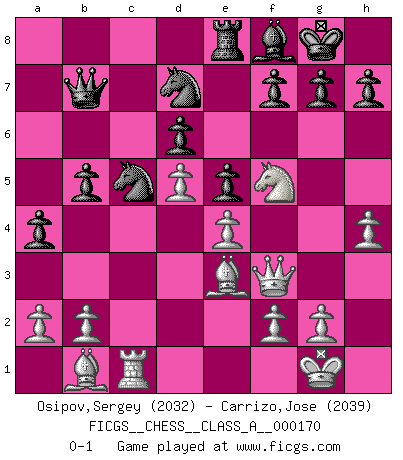 Last move : 0-1 2016 June 20 13:18:17 [Event "FICGS__CHESS__CLASS_A__000170"] [Site "FICGS"] [Date "2016.04.04"] [Round "1"] [White "Osipov,Sergey"] [Black "Carrizo,Jose"] [Result "0-1"] [WhiteElo "2032"] [BlackElo "2039"] 1.e4 e5 2.Nf3 Nc6 3.Bb5 a6 4.Ba4 Nf6 5.O-O Be7 6.Re1 b5 7.Bb3 d6 8.c3 O-O 9.h3 Na5 10.Bc2 c5 11.d4 Qc7 12.Nbd2 cxd4 13.cxd4 Nc6 14.Nb3 a5 15.Be3 a4 16.Nbd2 Bd7 17.Rc1 Qb7 18.Nf1 Rfe8 19.Ng3 Bd8 20.d5 Nb4 21.Bb1 Na6 22.Rf1 Be7 23.Nh4 Rac8 24.Nhf5 Bf8 25.Qf3 Bxf5 26.Nxf5 Nd7 27.Qg4 Kh8 28.h4 Rxc1 29.Rxc1 Nac5 30.Qf3 Kg8 0-1 Ruy Lopez : Closed Kingside Castling by player White (move 5) Kingside Castling by player Black (move 8) Player Black won this chess game. Follow this game move after move (download)War is the child of passion, passion is the child of narcissism and narcissism is the child. (...) Another game ? (Thibault de Vassal) Meine Liebe ist Schach, Schach, Schach. Ich muss jeden Tag Schach spielen, deshalb fühle ich mich so stark. (Miguel Najdorf) No soy una persona materialista y por eso, no resiento la falta o pérdida del dinero. La ausencia de cosas mundanas carece de importancia. Ya que el Ajedrez es una forma en la que puedo ser tan materialista como yo desee sin tener la necesidad de vender mi alma. (Jamie Walter Adams) La guerre est enfant de la passion, la passion est enfant du narcissisme et le narcissisme est l'enfant. (...) Une autre partie ? (Thibault de Vassal) When a man with money meets a man with experience, the man with experience leaves with money and the man with money leaves with experience. (Anonymous)