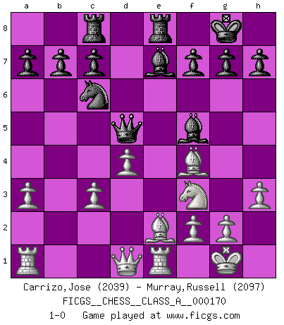 Last move : 1-0 2016 August 25 15:2:14 [Event "FICGS__CHESS__CLASS_A__000170"] [Site "FICGS"] [Date "2016.04.04"] [Round "1"] [White "Carrizo,Jose"] [Black "Murray,Russell"] [Result "1-0"] [WhiteElo "2039"] [BlackElo "2097"] 1.e4 e5 2.Nf3 Nf6 3.Nxe5 d6 4.Nf3 Nxe4 5.d4 d5 6.Bd3 Nc6 7.O-O Be7 8.c4 Nb4 9.Be2 O-O 10.Nc3 Bf5 11.a3 Nxc3 12.bxc3 Nc6 13.Re1 Re8 14.cxd5 Qxd5 15.Bf4 Rac8 16.h3 1-0 Petrov : Classical attack Kingside Castling by player White (move 7) Kingside Castling by player Black (move 9) Player White won this chess game. Follow this game move after move (download)Only the player with the initiative has the right to attack. (Wilhelm Steinitz) Es ist im Leben wie im Schachspiel. Wir entwerfen einen Plan, dieser bleibt jedoch bedingt durch das, was im Schachspiel dem Gegner, im Leben dem Schicksal zu tun belieben wird. (Arthur Schopenhauer) No es suficiente ser un buen jugador, se debe también de jugar bién. (Siegbert Tarrasch) Ne tendez aucun piège pour le plaisir ! Ne jouez rien dans l'espoir que l'adversaire réagisse de façon stupide ! Prenez toujours pour acquis que l'adversaire va trouver le meilleur coup ! Ne jouez jamais de coup dans l'espoir que l'adversaire ne voie pas la menace ! Chacun de vos coups doit améliorer la position d'une façon ou d'une autre. If you are going through hell, keep going. (Winston Churchill)