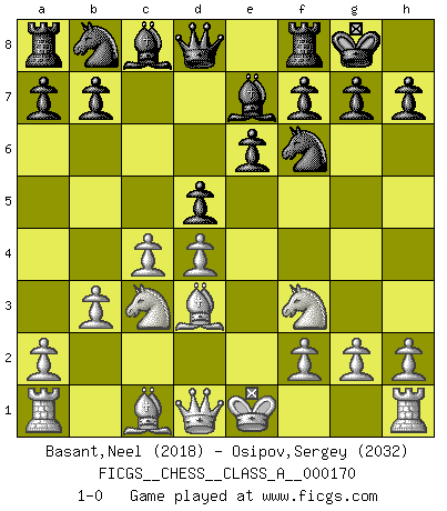 Last move : 1-0 2016 June 17 20:19:55 [Event "FICGS__CHESS__CLASS_A__000170"] [Site "FICGS"] [Date "2016.04.04"] [Round "1"] [White "Basant,Neel"] [Black "Osipov,Sergey"] [Result "1-0"] [WhiteElo "2018"] [BlackElo "2032"] 1.d4 Nf6 2.c4 e6 3.Nc3 d5 4.e3 Be7 5.b3 O-O 6.Nf3 c5 7.Bd3 cxd4 8.exd4 1-0 Queen's pawn game Kingside Castling by player Black (move 5) Player White won this chess game. Follow this game move after move (download)The game of Chess is not merely an idle amusement; several very valuable qualities of the mind are to be acquired and strengthened by it, so as to become habits ready on all occasions; for life is a kind of Chess. (Benjamin Franklin) Die Neutralität betrachte ich als eine schwere Krankheit. (Viktor Kortschnoi) Aquel que teme a un Peón de Reina aislado, debería de retirarse del Ajedrez. (Siegbert Tarrasch) Il n'y a plus de joueurs du niveau de Jacob Murray dont la seule quête est le beau jeu, le plaisir de voir les pièces construire quelque chose. Sur 10 idées à la minute, 9 seront sans intérêt, la dernière s'avèrera géniale. (Christian Bauer) A generalist learns less and less about more and more until he knows nothing about everything. (Author unknown)