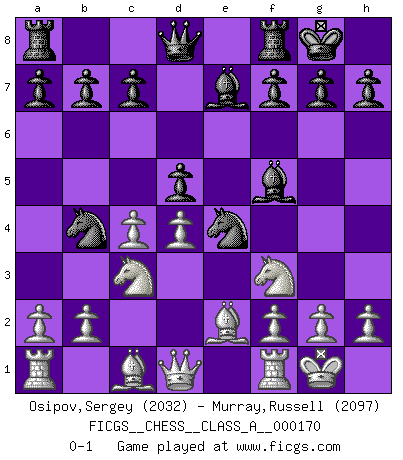 Last move : 0-1 2016 June 20 13:18:39 [Event "FICGS__CHESS__CLASS_A__000170"] [Site "FICGS"] [Date "2016.04.04"] [Round "1"] [White "Osipov,Sergey"] [Black "Murray,Russell"] [Result "0-1"] [WhiteElo "2032"] [BlackElo "2097"] 1.e4 e5 2.Nf3 Nf6 3.Nxe5 d6 4.Nf3 Nxe4 5.d4 d5 6.Bd3 Nc6 7.O-O Be7 8.c4 Nb4 9.Be2 O-O 10.Nc3 Bf5 0-1 Petrov : Classical attack Kingside Castling by player White (move 7) Kingside Castling by player Black (move 9) Player Black won this chess game. Follow this game move after move (download)Is Bobby Fischer quite sane ? (Salo Flohr) Immer nach dem besten Zug zu suchen ist ziemlich unpraktisch. (Nigel Short) Buenas posiciones no logran ganar juegos, buenas movidas sí. (Gerald Abrahams) La victoire dans une partie d'Echecs appartient la plupart du temps à celui qui voit un peu plus loin que l'adversaire. (Lasker) Always two there are. No more no less. A master, and an apprentice. (Master Yoda in Star Wars ep.1)