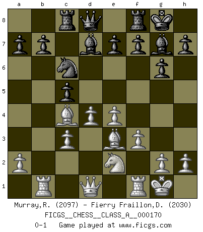 Last move : 0-1 2016 August 25 15:2:44 [Event "FICGS__CHESS__CLASS_A__000170"] [Site "FICGS"] [Date "2016.04.04"] [Round "1"] [White "Murray,Russell"] [Black "Fierry Fraillon,David"] [Result "0-1"] [WhiteElo "2097"] [BlackElo "2030"] 1.d4 Nf6 2.c4 g6 3.Nc3 d5 4.cxd5 Nxd5 5.e4 Nxc3 6.bxc3 Bg7 7.Bc4 O-O 8.Ne2 c5 9.O-O Nc6 10.Be3 Bg4 11.f3 Bd7 12.Rb1 Rc8 0-1 King's Indian defense, 3.Nc3 Kingside Castling by player Black (move 7) Kingside Castling by player White (move 9) Player Black won this chess game. Follow this game move after move (download)Many Chess players were surprised when after the game, Fischer quietly explained: 'I had already analyzed this possibility' in a position which I thought was not possible to foresee from the opening. (Mikhail Tal) Ein Isolani verdüstert die Stimmung auf dem ganzen Schachbrett. (Savielly Grigorievitsch Tartakower) No soy una persona materialista y por eso, no resiento la falta o pérdida del dinero. La ausencia de cosas mundanas carece de importancia. Ya que el Ajedrez es una forma en la que puedo ser tan materialista como yo desee sin tener la necesidad de vender mi alma. (Jamie Walter Adams) Vous n'êtes pas toujours obligé de jouer le meilleur coup. Un coup doit être actif, entreprenant, correct et beau ! (David Bronstein) Wawaweewa ! (Borat: Cultural learnings of America for make benefit glorious nation of Kazakhstan)