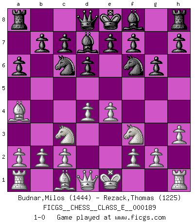Last move : 1-0 2016 July 10 1:5:16 [Event "FICGS__CHESS__CLASS_E__000189"] [Site "FICGS"] [Date "2016.04.05"] [Round "1"] [White "Budnar,Milos"] [Black "Rezack,Thomas"] [Result "1-0"] [WhiteElo "1444"] [BlackElo "1225"] 1.e4 d6 2.d4 Nf6 3.Nc3 Nc6 4.h3 Bd7 5.Nf3 g6 6.Bb5 a6 7.Ba4 1-0 This chess game has been lost on time (started : 2016.04.05 23:36:23) Pirc defense Player White won this chess game. Follow this game move after move (download)I play correspondence chess because it is both art and science while chess is art only. (A player at FICGS) Ich brauche nur einen Blick auf das Schachbrett zu werfen, und weiß schon, was in der Stellung steckt, was geschehen kann und was geschehen wird. Alle übrigen suchen und prüfen, ich aber weiß es! (José Raúl Capablanca) Yo adoro todas la posiciones. Denme una partida posicional difícil, y la jugaré. Pero posiciones totalmente ganadas, no las tolero. (Hein Donner) Dans le domaine de la peinture, de la gravure et de la sculpture, dès la première décennie de notre siècle, les artistes abandonnent la représentation de la partie d'échecs pour se concentrer sur les pièces, sur les échiquiers et sur toutes les variations auxquelles les unes et les autres peuvent donner lieu. On passe en quelque sorte d'un thème social à un thème musical (au sens de la musica médiévale, c'est-à-dire d'une notion qui inclue le rythme, l'harmonie, la construction et la déconstruction, etc.). Graphiquement et picturalement, l'échiquier apparaît comme une structure ouverte, dynamique, d'une richesse infinie, autorisant toutes les combinatoires et débouchant sur des mouvements et des rythmes de nature exponentielle. (Michel Pastoureau) Creativity is inventing, experimenting, growing, taking risks, breaking rules, making mistakes, and having fun. (Mary Lou Cook)