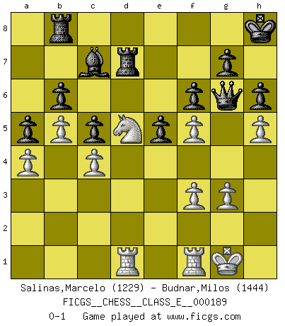 Last move : 0-1 2016 December 15 20:48:26 [Event "FICGS__CHESS__CLASS_E__000189"] [Site "FICGS"] [Date "2016.04.05"] [Round "1"] [White "Salinas,Marcelo"] [Black "Budnar,Milos"] [Result "0-1"] [WhiteElo "1229"] [BlackElo "1444"] 1.e4 e5 2.Nc3 Nf6 3.Qf3 b6 4.d4 d6 5.Bg5 h6 6.Bxf6 Qxf6 7.Nd5 Qd8 8.dxe5 dxe5 9.Qc3 Bd6 10.Bc4 Nd7 11.Bb5 c5 12.Nf3 O-O 13.b4 f6 14.O-O a6 15.Bxd7 Bxd7 16.a4 a5 17.b5 Be6 18.Nh4 Kh7 19.Qg3 Bf7 20.Nf5 Bg6 21.c4 Rab8 22.h4 Bxf5 23.exf5 Qd7 24.Qg4 Qf7 25.h5 Kh8 26.Rad1 Rfd8 27.f3 Rd7 28.g3 Bc7 29.Qg6 Qxg6 0-1 This chess game has been lost on time (started : 2016.04.05 23:36:23) Vienna : Falkbeer variation Kingside Castling by player Black (move 12) Kingside Castling by player White (move 14) Player Black won this chess game. Follow this game move after move (download)Nonsense was the last thing Fischer was interested in, as far as Chess was concerned. (Elie Agur) Gegen einen Schachcomputer zu verlieren ist wie Löcher in den Strümpfen zuhaben. Es ist nicht peinlich, solange man der einzige ist der es weiß. (Anonymous) Diferente gente reacciona diferentemente en aceptar la derrota. (Bobby Fischer) Vouloir jouer aux échecs contre soi-même est aussi paradoxal que vouloir marcher sur son ombre. (Stefan Zweig) SEO proverb : Make your website optimized for human beings, not for search engines.