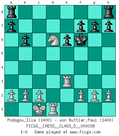 Last move : 1-0 2007 April 10 11:12:35 [Event "FICGS__CHESS__CLASS_D__000038"] [Site "FICGS"] [Date "2007.03.25"] [Round "1"] [White "Podogov,Ilia"] [Black "von Buttlar,Paul"] [Result "1-0"] [WhiteElo "1400"] [BlackElo "1400"] 1.e4 e6 2.d4 d5 3.e5 c5 4.Nf3 Nc6 5.Nc3 cxd4 6.Nxd4 Nxe5 7.Bf4 Bd6 8.Bb5+ Bd7 9.Qe2 Bxb5 10.Ndxb5 Nc4 11.Nxd6+ Nxd6 12.O-O-O Ne7 13.Nxd5 Nec8 14.Ne3 Qb6 15.Qd2 Ke7 16.Rhe1 Qc6 17.Bxd6+ Nxd6 18.Qxd6+ Qxd6 19.Nf5+ Kf6 20.Nxd6 b6 21.Re3 1-0 French : Advance, Nimzovich system Queenside Castling by player White (move 12) Player White won this chess game. Follow this game move after move (download)When in doubt... play Chess ! (Tevis) Schach wird sich dank seiner hohen kulturellen Tradition immer durchsetzen. In näherer Zukunft womöglich sogar als Gegenreaktion auf die maßlose Reizüberflutung im Freizeit- und Spielbereich. (Garry Kasparov) Con el fin de mejorar tu juego, debes de estudiar los finales antes que todo, ya que mientras que los finales pueden ser estudiados y dominados por sí mismos, el juegomedio y la apertura deben de ser estudiados en relación con los finales. (José Raúl Capablanca) C'est la seule position que je connaisse où les deux camps sont mals. Propos prêtés à V. Anand. Depression is just anger without enthusiasm. (Unknown)