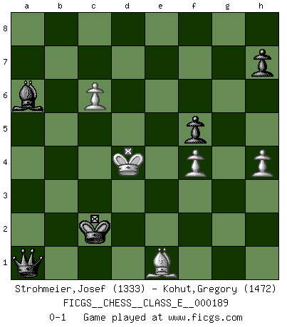 Last move : 0-1 2017 March 6 22:33:14 [Event "FICGS__CHESS__CLASS_E__000189"] [Site "FICGS"] [Date "2016.04.05"] [Round "1"] [White "Strohmeier,Josef"] [Black "Kohut,Gregory"] [Result "0-1"] [WhiteElo "1333"] [BlackElo "1472"] 1.e4 c5 2.Nf3 Nc6 3.d4 cxd4 4.Nxd4 g6 5.Nc3 Bg7 6.Be3 Nf6 7.Bc4 O-O 8.f3 d5 9.exd5 Nb4 10.Nde2 Qc7 11.Bb3 Rd8 12.a3 Nbxd5 13.Nxd5 Nxd5 14.Bxd5 e6 15.c3 Rxd5 16.Qc2 b6 17.O-O Bb7 18.Rad1 Rad8 19.Rxd5 Rxd5 20.Rd1 Qd7 21.Rxd5 Qxd5 22.Bd4 e5 23.Bf2 f5 24.h3 Ba6 25.Nc1 Bh6 26.Qb3 Qxb3 27.Nxb3 Kf7 28.Be1 Ke6 29.Kf2 Kd5 30.Nd2 Bxd2 31.Bxd2 Kc4 32.b4 Kb3 33.g4 Kxa3 34.Ke3 Kb3 35.h4 Kc2 36.Be1 Bb7 37.gxf5 gxf5 38.f4 e4 39.Kd4 a5 40.bxa5 bxa5 41.Kc4 Ba6+ 42.Kd5 a4 43.c4 a3 44.Kd4 a2 45.Bc3 e3 46.c5 e2 47.c6 e1Q 48.Bxe1 a1Q+ 0-1 Sicilian : Accelerated Fianchetto, Modern variation with Bc4 Kingside Castling by player Black (move 7) Kingside Castling by player White (move 17) Promotion Queen by player Black (move 47) 10 pieces endgame at move 48 : White KBPPP , Black KBPPP WHITE : King + 1 Bishop 3 Pawns BLACK : King + 1 Bishop 3 Pawns Promotion Queen by player Black (move 48) Player Black won this chess game. Follow this game move after move (download)The battle for the ultimate truth will never be won. And that's why Chess is so fascinating. (Hans Kmoch) Rauchen ist dem Schachspieler bei seiner Arbeit, also im Wettkampf, untersagt. (Viktor Kortschnoi) Si no le temes a Spassky, entonces elimino el elemento del dinero. (Jim Slater) Fischer est le meilleur joueur du monde et Karpov n'est qu'un joueur de bistrot. (Garry Kasparov, agé de 16 ans) Logic : The art of thinking and reasoning in strict accordance with the limitations and incapacities of the human misunderstanding. (Ambrose Bierce)