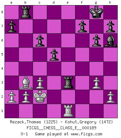 Last move : 0-1 2016 November 29 15:12:24 [Event "FICGS__CHESS__CLASS_E__000189"] [Site "FICGS"] [Date "2016.04.05"] [Round "1"] [White "Rezack,Thomas"] [Black "Kohut,Gregory"] [Result "0-1"] [WhiteElo "1225"] [BlackElo "1472"] 1.e4 c5 2.Nf3 Nc6 3.d4 cxd4 4.Nxd4 g6 5.Nxc6 bxc6 6.Bg5 Bg7 7.c3 Nf6 8.Bc4 Nxe4 9.Be3 d5 10.Bb3 Ba6 11.Nd2 Nxd2 12.Qxd2 O-O 13.O-O-O Rb8 14.Bh6 Qc7 15.Bf4 e5 16.Bg3 Rfd8 17.Qe3 Qb6 18.Bxe5 Qxe3+ 19.fxe3 Bxe5 20.g3 Bg7 21.Rhf1 Bxf1 22.Rxf1 Bh6 23.Re1 Re8 24.Kd2 Re6 25.Kc2 Rxe3 0-1 Sicilian : Accelerated Fianchetto, Exchange variation Kingside Castling by player Black (move 12) Queenside Castling by player White (move 13) Player Black won this chess game. Follow this game move after move (download)I won't play with you anymore. You have insulted my friend. - When an opponent cursed himself for a blunder. (Miguel Najdorf) Schach ist ein Teil der Kultur, und wenn es mit der Kultur abwärts geht, geht es auch mit dem Schach abwärts. (Mikhail Moiseyevich Botvinik) Yo no creo en la psicología. Yo creo en las buenas movidas. (Bobby Fischer) Vous m'avez demandé de vous exposer quel est le fondement de la prière. Je ne fais que préparer les pièces du jeu sur la table... Nous sera-t-il permis d'en adopter les règles et si nous les appliquons scrupuleusement nous ne tarderons pas à faire mat le Roi divin ! Il ne pourra échapper à nos mains. (Sainte Thérèse d'Avila, Chemin de perfection) Begin at the beginning and go on till you come to the end; then stop. (Lewis Carrol, Alice in Wonderland)
