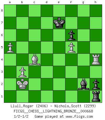 Last move : 1/2-1/2 2016 April 7 2:42:57 [Event "FICGS__CHESS__LIGHTNING_BRONZE__000668"] [Site "FICGS"] [Date "2016.04.07"] [Round "1"] [White "Llull,Roger"] [Black "Nichols,Scott"] [Result "1/2-1/2"] [WhiteElo "2406"] [BlackElo "2299"] 1.e4 d6 2.d4 Nf6 3.Nc3 g6 4.Be3 c6 5.f3 Bg7 6.Qd2 O-O 7.h4 h5 8.O-O-O b5 9.Kb1 Re8 10.Bh6 Bxh6 11.Qxh6 e5 12.dxe5 Rxe5 13.Nh3 b4 14.Ne2 d5 15.Nf2 Qf8 16.Qf4 Nbd7 17.Nd4 Bb7 18.Nd3 Re7 19.e5 Ne8 20.g4 c5 21.Nf5 gxf5 22.gxf5 f6 23.e6 c4 24.exd7 cxd3 25.dxe8Q dxc2+ 26.Kxc2 Raxe8 27.Rg1+ Kh7 28.Kb1 a5 29.Bb5 Rc8 30.Qd4 Rg7 31.Rde1 R8c7 32.Be8 Rxg1 33.Qxg1 Re7 34.Bg6+ Kh8 35.Rc1 d4 36.Qxd4 Bxf3 37.Qd6 Bg4 38.Ka1 Kg8 39.Qd5+ Kg7 40.Rg1 Kh8 41.Qxa5 Rd7 42.Re1 Kg7 43.Qb6 Qd6 44.Qxd6 Rxd6 45.b3 Rd2 46.Re7+ Kg8 47.Re4 Rd1+ 48.Kb2 Rd2+ 49.Kb1 Rh2 50.Rxb4 Rxh4 51.Re4 Rh1+ 52.Kb2 Bf3 53.Re3 Rf1 54.Re7 h4 55.Rh7 Rh1 56.a4 Bd5 57.Rd7 Be4 58.Bf7+ Kf8 59.Rd4 Bg2 60.Be6 h3 61.a5 h2 62.Rh4 Ke7 63.Bc4 1/2-1/2 Pirc defense Kingside Castling by player Black (move 6) Queenside Castling by player White (move 8) Promotion Queen by player White (move 25) This chess game ended in a draw. Follow this game move after move (download)Pawns: they are the soul of this game, they alone form the attack and defense. (Philidor) Wenn Schach ein enormer Dschungel ist, der seine Myriaden von Geheimnissen nicht preisgeben will, dann sind Computer die Kettensägen einer gewaltigen ökologisch unsensiblen Nutzholzfirma. (Nigel Short) ¿Que sería del Ajedrez sin errores graciosos?. (Kurt Richter) Les Echecs représentent une sphère d'idées créatrices basée sur la volonté des deux protagonistes. (Smyslov) Fortune favours the audacious. (Desiderius Erasmus)