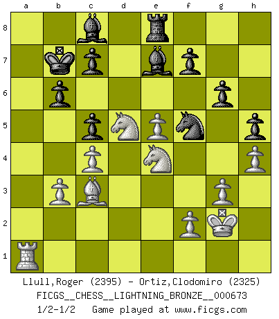 Last move : 1/2-1/2 2016 April 8 19:51:5 [Event "FICGS__CHESS__LIGHTNING_BRONZE__000673"] [Site "FICGS"] [Date "2016.04.08"] [Round "1"] [White "Llull,Roger"] [Black "Ortiz,Clodomiro"] [Result "1/2-1/2"] [WhiteElo "2395"] [BlackElo "2325"] 1.e4 e5 2.Nf3 Nc6 3.Bb5 Nf6 4.O-O Nxe4 5.d4 Nd6 6.Bxc6 dxc6 7.dxe5 Nf5 8.Qxd8+ Kxd8 9.Nc3 Be7 10.Rd1+ Ke8 11.b3 Be6 12.Bb2 Rd8 13.g3 h5 14.h4 c5 15.Rxd8+ Kxd8 16.Ne2 Bd7 17.Nf4 Bc6 18.Rd1+ Kc8 19.Nd5 Bd8 20.c4 b6 21.Kf1 a5 22.Ke2 Re8 23.Kf1 a4 24.Bc3 Bd7 25.Kg2 g6 26.Kg1 Nh6 27.Re1 Kb7 28.Nd2 axb3 29.axb3 Be7 30.Ne4 Be6 31.Kg2 Nf5 32.Ra1 Bc8 1/2-1/2 Ruy Lopez : Berlin defense, Open variation Kingside Castling by player White (move 4) This chess game ended in a draw. Follow this game move after move (download)Fischer, who may or may not be mad as a hatter, has every right to be horrified. (Jeremy Silman) Darum geht es im Schach. Einen Tag gibst du deinem Gegner eine Lektion, am nächsten Tag gibt er dir eine. (Robert James Fischer) En el tablero, la mentira e hipocresía no sobreviven mucho. (Emanuel Lasker) A chaque perte on perd un peu de soi. (Joël Lautier) Optimism is a variety of information deficit. Sometimes especially true for correspondence chess games. (Michael Aigner)