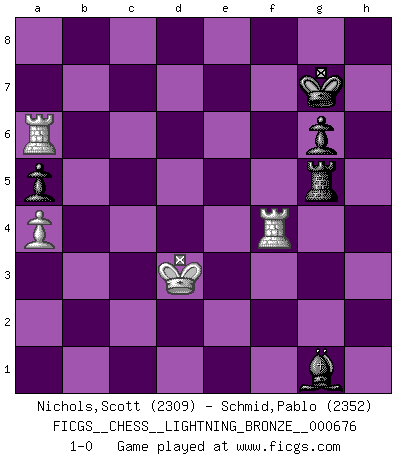 Last move : 1-0 2016 April 9 17:20:32 [Event "FICGS__CHESS__LIGHTNING_BRONZE__000676"] [Site "FICGS"] [Date "2016.04.09"] [Round "1"] [White "Nichols,Scott"] [Black "Schmid,Pablo"] [Result "1-0"] [WhiteElo "2309"] [BlackElo "2352"] 1.Nf3 d5 2.g3 c6 3.Bg2 Bg4 4.O-O Nd7 5.d4 Ngf6 6.Nbd2 e6 7.Re1 Be7 8.e4 O-O 9.c3 Bh5 10.Qb3 Rb8 11.c4 dxe4 12.Nxe4 Nxe4 13.Rxe4 b5 14.c5 Bxf3 15.Bxf3 Nf6 16.Rh4 Nd5 17.Re4 Bf6 18.Bd2 a5 19.Rd1 Rb7 20.Kg2 Rd7 21.h4 Qc7 22.a4 b4 23.Qc4 Rfd8 24.Re2 Qb7 25.Be3 Qc8 26.Red2 Rb7 27.Qe2 Rbd7 28.Be4 Re8 29.Qf3 Be7 30.Re1 Qc7 31.h5 Qd8 32.Qe2 Bg5 33.f4 Be7 34.Bf2 Qc7 35.Qd3 Nf6 36.Bf3 Red8 37.Qc2 g6 38.Rde2 Kg7 39.Qc1 Bf8 40.Rh1 Kg8 41.g4 Rxd4 42.hxg6 hxg6 43.f5 exf5 44.Bxd4 Rxd4 45.gxf5 Rf4 46.fxg6 fxg6 47.Rh3 Rf5 48.Rg3 Qf7 49.Qe3 Rxc5 50.Be4 Nd5 51.Bxd5 Qxd5+ 52.Qf3 Kh7 53.Qxd5 Rxd5 54.Rf3 Bd6 55.Rf7+ Kh6 56.Re6 b3 57.Kf3 Be5 58.Rb7 Bxb2 59.Rxb3 Bg7 60.Rxc6 Rd4 61.Ra3 Bf8 62.Ra1 Rh4 63.Ra6 Rh3+ 64.Kg4 Rh5 65.Rc1 Be7 66.Rc7 Bd8 67.Rd7 Rg5+ 68.Kf3 Rf5+ 69.Ke4 Bg5 70.Kd3 Bh4 71.R7d6 Rg5 72.Re6 Rg3+ 73.Kd2 Rg2+ 74.Re2 Rg5 75.Re4 Bf2 76.Kd3 Bg1 77.Rh4+ Kg7 78.Rf4 1-0 Reti : King's Indian attack (Barcza system) Kingside Castling by player White (move 4) Kingside Castling by player Black (move 8) 10 pieces endgame at move 59 : White KRRP , Black KRBPPP WHITE : King + 2 Rooks 1 Pawn BLACK : King + 1 Rook 1 Bishop 3 Pawns 9 pieces endgame at move 60 : White KRRP , Black KRBPP WHITE : King + 2 Rooks 1 Pawn BLACK : King + 1 Rook 1 Bishop 2 Pawns Player White won this chess game. Follow this game move after move (download)No other master has such a terrific will to win. At the board he radiates danger, and even the strongest opponents tend to freeze, like rabbits when they smell a panther. Even his weaknesses are dangerous. As white, his opening game is predictable - you can make plans against it - but so strong that your plans almost never work. In the middle game his precision and invention are fabulous, and in the end game you simply cannot beat him. (Anonymous German Expert) Frage des Reporters: -Welche besonderen Umstände rechtfertigen das Anhalten der Uhren während einer Turnierpartie? Antwort: -Einen Fotographen zu strangulieren. (Siegbert Tarrasch) Después de la respuesta de las negras a 1.e4 con 1..e5, se quedan siempre tratando de entrar dentro del juego. (Howard Staunton) Le succès, c'est être capable d'aller d'échec en échec sans perdre son enthousiasme. (Winston Churchill) He is a liar. I just don't know what the lie is yet. (Horatio Caine, C.S.I. Miami)