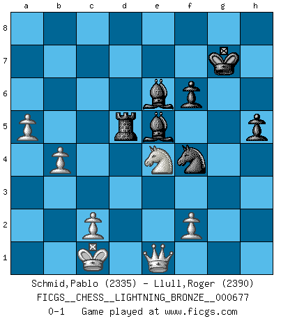 Last move : 0-1 2016 April 9 20:41:50 [Event "FICGS__CHESS__LIGHTNING_BRONZE__000677"] [Site "FICGS"] [Date "2016.04.09"] [Round "1"] [White "Schmid,Pablo"] [Black "Llull,Roger"] [Result "0-1"] [WhiteElo "2335"] [BlackElo "2390"] 1.e4 e5 2.Bc4 Nf6 3.d4 exd4 4.Nf3 Nxe4 5.Qxd4 Nf6 6.Nc3 Nc6 7.Qh4 Ne7 8.Bg5 Ng6 9.Qd4 c6 10.O-O-O Be7 11.Bxf6 gxf6 12.Rhe1 d5 13.Bxd5 cxd5 14.Nxd5 Be6 15.Nxf6+ Bxf6 16.Qa4+ Kf8 17.Rxd8+ Rxd8 18.Qxa7 Bc8 19.Qb6 Kg7 20.Qb4 h6 21.Rd1 Rxd1+ 22.Kxd1 Rd8+ 23.Kc1 Rd5 24.a3 Bd7 25.Qxb7 Nf4 26.Nd2 Be6 27.Qa6 Nxg2 28.Ne4 Be5 29.Qe2 h5 30.a4 Bxh2 31.b4 Be5 32.a5 Nf4 33.Qe1 f6 0-1 Bishop's Opening : Urusov gambit Queenside Castling by player White (move 10) Player Black won this chess game. Follow this game move after move (download)When you absolutely don't know what to do anymore, it is time to panic. (John van der Wiel) Später, ... hatte ich zunehmend Erfolg in entscheidenden Partien. Vielleicht weil ich eine einfache Wahrheit erkannte: nicht nur ich hatte Angst, auch mein Gegner. (Mikhail Nekhemyevich Tal) El Ajedrez se juega con la mente... ¡no con las manos!. (Renaud y Kahn) Des combinaisons [dans le jeu d'échecs] pareilles à des mélodies. Je crois entendre pour ainsi dire la musique des coups... (Vladimir Nabokov) The project of the man are lower than those of the sky. (Chinese proverb)