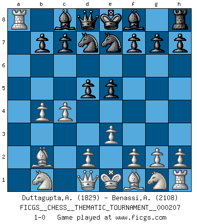 Last move : 1-0 2016 April 15 19:0:54 [Event "FICGS__CHESS__THEMATIC_TOURNAMENT__000207"] [Site "FICGS"] [Date "2016.04.09"] [Round "1"] [White "Duttagupta,Aniruddha"] [Black "Benassi,Aspasio"] [Result "1-0"] [WhiteElo "1829"] [BlackElo "2108"] 1.b4 e5 2.a3 d5 3.e3 a5 4.Bb2 Nd7 5.c4 axb4 6.axb4 Ne7 7.Rxa8 1-0 Polish (Sokolsky) opening Player White won this chess game. Follow this game move after move (download)Chess mastery essentially consists of analyzing Chess positions accurately. (Mikhail Botvinnik) Man kann eine Schachpartie nur gewinnen, wenn das Gleichgewicht gestört ist. In einer Stellung mit ungestörtem Gleichgewicht ist auch das größte Genie hilflos - in der Stellung steckt dann eben kein genialer Einfall. (Wilhelm Steinitz) La batalla por la última verdad nunca sera ganada. Y es por eso que el Ajedrez es tan fascinante. (Hans Kmoch) Tous ces prétendus hommes politiques sont les pions, les Cavaliers, les Tours ou les Fous d'une partie d'échecs qui se jouera tant qu'un hasard ne renversera pas l'échiquier. (Honoré de Balzac) Control your own destiny or someone else will. (Jack Welch)