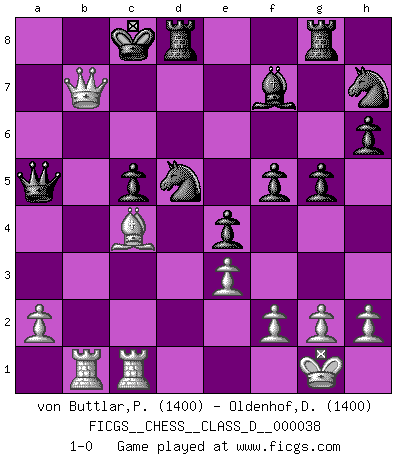 Last move : 1-0 2007 April 9 12:44:27 [Event "FICGS__CHESS__CLASS_D__000038"] [Site "FICGS"] [Date "2007.03.25"] [Round "1"] [White "von Buttlar,Paul"] [Black "Oldenhof,Dwight"] [Result "1-0"] [WhiteElo "1400"] [BlackElo "1400"] 1.c4 e5 2.Nc3 Bb4 3.Nf3 Nc6 4.d4 Bxc3+ 5.bxc3 e4 6.Ng1 d5 7.cxd5 Qxd5 8.Bf4 Qa5 9.Qd2 Be6 10.e3 O-O-O 11.Ne2 h6 12.Nc1 Nf6 13.Be2 g5 14.Bg3 Nh7 15.O-O f5 16.Nb3 Qa3 17.Nc5 Qxc5 18.Qb2 Qa5 19.Rab1 b6 20.c4 Bf7 21.d5 Ne7 22.Rfc1 Qc5 23.Be5 Rhg8 24.Bd4 Qa5 25.c5 Nxd5 26.cxb6 axb6 27.Bc4 c5 28.Bxc5 bxc5 29.Qb7+ 1-0 English, Kramnik-Shirov counterattack Queenside Castling by player Black (move 10) Kingside Castling by player White (move 15) Player White won this chess game. Follow this game move after move (download)You need not play well - just help your opponent to play badly. (Genrikh Chepukaitis) Ich hatte meine größten Erfolge, als ich 47 Jahre alt war. Kasparow war noch nicht mal 42 und hat das Schach schon im Stich gelassen. (Viktor Kortschnoi) A través de las casillas del tablero, los Indios explican el movimiento del tiempo y la edad, las influencias mas altas que controlan el mundo y los lazos que vinculan al Ajedrez con el alma humana. (Al-Masudi) Les Echecs, c'est l'art de la guerre sans les charniers, c'est la résurrection des morts tombés au champ d'honneur, l'espoir perpétuel, la suprématie de l'intelligence sur la force, la culture de l'esprit. (F. Szpiner) They say poker is a zero-sum game. It must be, because every time I play my sum ends up zero. (Max Shapiro)