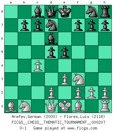 Last move : 0-1 2016 July 7 12:51:35 [Event "FICGS__CHESS__THEMATIC_TOURNAMENT__000207"] [Site "FICGS"] [Date "2016.04.09"] [Round "1"] [White "Arefev,German"] [Black "Flores,Luis"] [Result "0-1"] [WhiteElo "2000"] [BlackElo "2118"] 1.b4 e5 2.a3 d5 3.Bb2 a5 4.e3 Nd7 5.c4 axb4 6.axb4 Rxa1 7.Bxa1 Bxb4 8.Nf3 Bd6 0-1 This chess game has been lost on time (started : 2016.04.09 19:55:51) Polish (Sokolsky) opening Player Black won this chess game. Follow this game move after move (download)Chess is imagination. (David Bronstein) Ich hatte Angst gegen einen russischen Großmeister zu verlieren, und er befürchtete gegen einen kleinen Jungen zu verlieren. (über ein Remis gegen Juri Awerbach). (Robert James Fischer) El Ajedrez es realmente noventa y nueve por ciento calculación. (Soltis) Il n'y a pas de prix trop élevé au scalp de l'ennemi. (Koblentz) Perseverance does not equal worthiness. Next time you want to get my attention, wear something fun. Low-riding jeans are hot. (Gregory House, House M.D.)