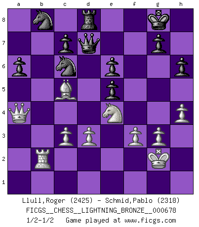 Last move : 1/2-1/2 2016 April 9 21:52:54 [Event "FICGS__CHESS__LIGHTNING_BRONZE__000678"] [Site "FICGS"] [Date "2016.04.09"] [Round "1"] [White "Llull,Roger"] [Black "Schmid,Pablo"] [Result "1/2-1/2"] [WhiteElo "2425"] [BlackElo "2318"] 1.e4 e5 2.Nf3 Nc6 3.Bc4 Nf6 4.d3 Bc5 5.Nc3 d6 6.Na4 Bb6 7.c3 Be6 8.Bxe6 fxe6 9.b4 O-O 10.O-O Qe8 11.h3 Nh5 12.Nxb6 axb6 13.a4 h6 14.Be3 Ne7 15.Kh2 Qf7 16.a5 bxa5 17.Rxa5 Rxa5 18.bxa5 Nf4 19.g3 Nfg6 20.Nd2 Nc6 21.a6 bxa6 22.Qa4 Nb8 23.Rb1 Ne7 24.Rb7 Nec6 25.Kg2 Qd7 26.f3 Qc8 27.Rb3 Ne7 28.Qc4 d5 29.Qa4 Nec6 30.Rb2 Qd7 31.Bc5 Rd8 32.Bf2 Rf8 33.Bc5 Rd8 34.h4 dxe4 35.Nxe4 1/2-1/2 Two knights defense (Modern Bishop's Opening) Kingside Castling by player Black (move 9) Kingside Castling by player White (move 10) This chess game ended in a draw. Follow this game move after move (download)In life, as in Chess, one's own Pawns block one's way. A man's very wealth, ease, leisure, children, books, which should help him to win, more often checkmate him. (Charles Buxton) Unter Putin wird alles Geld aus Russland wie von einem Staubsauger nach Moskau umgeleitet, das ist wie ein schwarzes Loch. (Garry Kasparov) El pensamiento metódico es mas útil en el Ajedrez que la inspiración. (C. J. S. Purdy) J'apprécie les joueurs d'est-indienne, c'est grâce à eux que je nourris ma famille depuis tant d'années. (Petrosian) I'll be back. (Arnold Schwarzenegger)