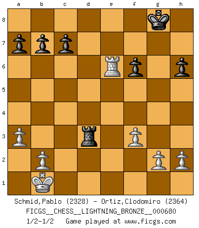 Last move : 1/2-1/2 2016 April 10 1:45:28 [Event "FICGS__CHESS__LIGHTNING_BRONZE__000680"] [Site "FICGS"] [Date "2016.04.10"] [Round "1"] [White "Schmid,Pablo"] [Black "Ortiz,Clodomiro"] [Result "1/2-1/2"] [WhiteElo "2328"] [BlackElo "2364"] 1.e4 e5 2.Nf3 Nc6 3.d4 exd4 4.Nxd4 Bc5 5.Nb3 Bb6 6.Nc3 Nf6 7.Qe2 O-O 8.Be3 d5 9.O-O-O d4 10.Bg5 h6 11.Bh4 Bg4 12.f3 Be6 13.Kb1 Qe7 14.Na4 Rfd8 15.a3 d3 16.Rxd3 Rxd3 17.Nxb6 Rad8 18.cxd3 Bxb3 19.Nd5 Bxd5 20.exd5 Qxe2 21.Bxe2 Nd4 22.Bd1 Rxd5 23.Re1 Ne6 24.Bb3 Rxd3 25.Bxe6 fxe6 26.Bxf6 gxf6 27.Rxe6 1/2-1/2 Scotch : Potter variation Kingside Castling by player Black (move 7) Queenside Castling by player White (move 9) This chess game ended in a draw. Follow this game move after move (download)The blunders are all there on the board, waiting to be made. (Savielly Tartakover) Die größte Kunst beim Schach besteht darin dem Gegner nicht zu zeigen was er tun kann. (Garry Kasparov) Una clavada es mas poderosa que una espada. (Fred Reinfeld) La tactique est l'élément le plus important du milieu de jeu. (Siegbert Tarrasch) The good fighters of old first put themselves beyond the possibility of defeat, and then waited for an opportunity of defeating the enemy. (Sun Tzu)