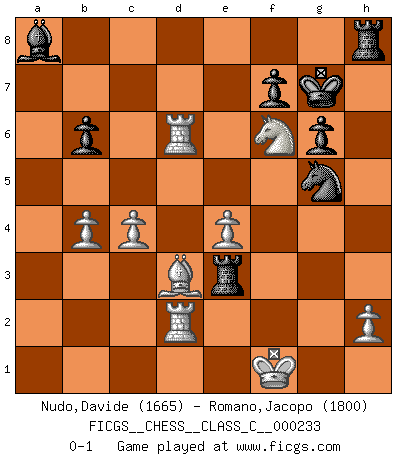 Last move : 0-1 2016 November 16 16:50:44 [Event "FICGS__CHESS__CLASS_C__000233"] [Site "FICGS"] [Date "2016.04.13"] [Round "1"] [White "Nudo,Davide"] [Black "Romano,Jacopo"] [Result "0-1"] [WhiteElo "1665"] [BlackElo "1800"] 1.e4 c5 2.Nf3 g6 3.d4 cxd4 4.Nxd4 Nc6 5.Be3 Nf6 6.Nc3 Bg7 7.Be2 d6 8.O-O O-O 9.f4 Qb6 10.Qd3 Ng4 11.Bxg4 Bxd4 12.Bxd4 Qxd4+ 13.Qxd4 Nxd4 14.Bd1 e5 15.Nd5 exf4 16.Rxf4 Kg7 17.c3 Ne6 18.Rf2 b6 19.Bc2 Bb7 20.Nf6 h5 21.a4 Rfd8 22.a5 Bc6 23.b4 h4 24.Nd5 Ng5 25.Nf6 h3 26.c4 Rh8 27.Rd1 Rac8 28.axb6 axb6 29.Rxd6 Ba8 30.Bd3 hxg2 31.Kxg2 Rh3 32.Kf1 Re3 33.Rd2 Rh8 0-1 Sicilian : Hungarian variation Kingside Castling by player White (move 8) Kingside Castling by player Black (move 8) Player Black won this chess game. Follow this game move after move (download)The blunders are all there on the board, waiting to be made. (Savielly Tartakover) Es ist besser die Steine des Gegners zu opfern. (Savielly Grigorievitsch Tartakower) Aún el Rey más flojo huye despavorido ante la amenaza de un Jaque doble. (Aaron Nimzowitsch) Le génie consiste à savoir transgresser les règles au moment opportun. (Teichmann) Big Chess is a place for big hallucinations. (Thibault de Vassal)