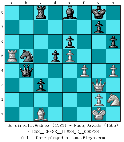 Last move : 0-1 2016 June 12 6:27:37 [Event "FICGS__CHESS__CLASS_C__000233"] [Site "FICGS"] [Date "2016.04.13"] [Round "1"] [White "Sorcinelli,Andrea"] [Black "Nudo,Davide"] [Result "0-1"] [WhiteElo "1921"] [BlackElo "1665"] 1.e4 e6 2.d4 d5 3.Nc3 Bb4 4.e5 c5 5.a3 Bxc3+ 6.bxc3 Ne7 7.Qg4 O-O 8.Bd3 c4 9.Bh6 Ng6 10.Bxg6 fxg6 11.Bd2 Qe8 12.Nf3 Nc6 13.O-O b5 14.h4 a5 15.Nh2 Bd7 16.f4 h6 17.Qg3 b4 18.axb4 axb4 19.cxb4 Rxa1 20.Rxa1 Nxd4 21.Qf2 Nxc2 22.Rc1 Na3 23.Ra1 Nb5 24.Ra5 Qe7 25.Qg3 Rc8 26.Qxg6 Be8 27.Qg3 c3 28.Bc1 Qxb4 0-1 French : Winawer, Advance, poisoned pawn variation Kingside Castling by player Black (move 7) Kingside Castling by player White (move 13) Player Black won this chess game. Follow this game move after move (download)I have never in my life played the French Defence, which is the dullest of all openings. (Wilhelm Steinitz) Kann Schach nicht schließlich das Nationalspiel der Deutschen werden? Und welche weiteren Ausblicke bieten sich dann dar! Welche Hebung des allgemeinen Kultur-Niveaus, ja der Moral, wenn das Schachbrett den Kartentisch verdrängen würde! Wahrlich, ein Ziel, des Schweißes der Edlen wert! (Siegbert Tarrasch) Antes de los Finales, los dioses han colocado el Juego Medio. (Siegbert Tarrasch) A chaque perte on perd un peu de soi. (Joël Lautier) They misunderestimated me. (George W. Bush, Bentonville nov. 6, 2000)