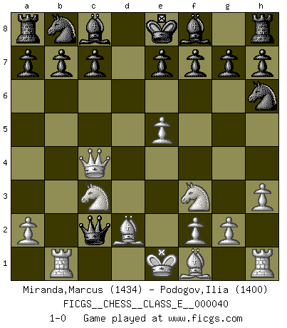 Last move : 1-0 2007 June 10 0:53:0 [Event "FICGS__CHESS__CLASS_E__000040"] [Site "FICGS"] [Date "2007.03.25"] [Round "1"] [White "Miranda,Marcus"] [Black "Podogov,Ilia"] [Result "1-0"] [WhiteElo "1434"] [BlackElo "1400"] 1.d4 d5 2.c4 Nf6 3.cxd5 Qxd5 4.Nc3 Qa5 5.Bd2 Qb6 6.e4 Qxd4 7.Nf3 Qb6 8.e5 Ng4 9.Qe2 Qxb2 10.Rb1 Qc2 11.h3 Nh6 12.Qc4 1-0 QGD : Marshall defense Player White won this chess game. Follow this game move after move (download)Later, I began to succeed in decisive games. Perhaps because I realized a very simple truth: not only was I worried, but also my opponent. (Mikhail Tal) Es liegt in der Natur, vernüftig zu denken und unlogisch zu handeln. (Anatole France) Un buen sacrificio es aquel que aunque no sea necesariamente sólido, deja a tu oponente aturdido y confuso. (Rudolph Spielmann) La victoire dans une partie d'Echecs appartient la plupart du temps à celui qui voit un peu plus loin que l'adversaire. (Lasker) Everything in life is luck. (Donald Trump)