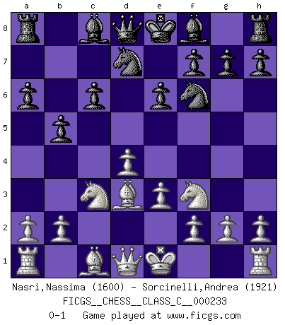 Last move : 0-1 2016 July 11 1:11:20 [Event "FICGS__CHESS__CLASS_C__000233"] [Site "FICGS"] [Date "2016.04.13"] [Round "1"] [White "Nasri,Nassima"] [Black "Sorcinelli,Andrea"] [Result "0-1"] [WhiteElo "1600"] [BlackElo "1921"] 1.d4 Nf6 2.Nf3 d5 3.c4 c6 4.Nc3 e6 5.e3 Nbd7 6.Bd3 dxc4 7.Bxc4 b5 8.Bd3 a6 0-1 This chess game has been lost on time (started : 2016.04.13 20:23:34) Queen's pawn game Player Black won this chess game. Follow this game move after move (download)In Chess, as it is played by masters, chance is practically eliminated. (Emanuel Lasker) Mein Gehirn das ist mein zweitwichtigstes Organ [Aus dem Film: Der Schläfer]. (Woody Allen) La maestría del Ajedrez consiste esencialmente en analizar posiciónes de Ajedrez con precisión. (Mikhail Botvinnik) Aux échecs, l'amour-propre est satisfait quand on remporte la victoire, mais il n'y a pas de honte à être battu. (Benjamin Franklin) The problem with manipulation is that people can turn on you. (Horatio Caine, C.S.I. Miami)