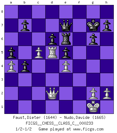 Last move : 1/2-1/2 2016 July 2 17:40:13 [Event "FICGS__CHESS__CLASS_C__000233"] [Site "FICGS"] [Date "2016.04.13"] [Round "1"] [White "Faust,Dieter"] [Black "Nudo,Davide"] [Result "1/2-1/2"] [WhiteElo "1644"] [BlackElo "1665"] 1.e4 c5 2.Nf3 d6 3.Bb5+ Bd7 4.Bxd7+ Qxd7 5.O-O Nc6 6.c3 Nf6 7.d4 Nxe4 8.d5 Ne5 9.Re1 Nxf3+ 10.Qxf3 Nf6 11.c4 e5 12.dxe6 fxe6 13.Nc3 Be7 14.Bg5 Rd8 15.Rad1 O-O 16.Qh3 e5 17.Qd3 Ng4 18.Bxe7 Qxe7 19.Ne4 Nf6 20.f3 Nxe4 21.Rxe4 g6 22.Qd5+ Kg7 23.b3 a6 24.Qd2 Qc7 25.Qe2 Rde8 26.Rd5 Re6 27.Qd2 Qe7 28.a4 Rf4 29.b4 Rxe4 30.fxe4 cxb4 31.c5 a5 1/2-1/2 Sicilian : Canal-Sokolsky attack, Bronstein gambit Kingside Castling by player White (move 5) Kingside Castling by player Black (move 15) This chess game ended in a draw. Follow this game move after move (download)The combination player thinks forward; he starts from the given position, and tries the forceful moves in his mind. (Emanuel Lasker) Ich las kürzlich ein Buch von Nietzsche. Er sagte Religion verdumme nur die Menschen. Ich stimme zu. (Robert James Fischer) Cuando tu no sabes absolutamente que mas hacer, es tiempo de entrar en pánico. (John van der Wiel) J'apprécie les joueurs d'est-indienne, c'est grâce à eux que je nourris ma famille depuis tant d'années. (Petrosian) Before all elsed, be armed. (Niccolo Machiavelli)