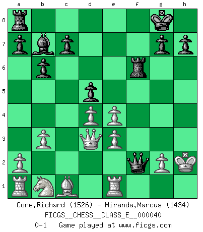 Last move : 0-1 2007 April 29 5:5:2 [Event "FICGS__CHESS__CLASS_E__000040"] [Site "FICGS"] [Date "2007.03.25"] [Round "1"] [White "Core,Richard"] [Black "Miranda,Marcus"] [Result "0-1"] [WhiteElo "1526"] [BlackElo "1434"] 1.Nf3 Nf6 2.d4 e6 3.c4 b6 4.e3 Bb7 5.Bd3 d5 6.O-O Bd6 7.b3 O-O 8.cxd5 exd5 9.Re1 Ne4 10.Ne5 f6 11.Ng4 Nc6 12.f3 f5 13.fxe4 fxg4 14.Qxg4 Nb4 15.Qe2 Nxd3 16.Qxd3 Bxh2+ 17.Kxh2 Qh4+ 18.Kg1 Qf2+ 19.Kh2 Rf6 0-1 Reti Opening Kingside Castling by player White (move 6) Kingside Castling by player Black (move 7) Player Black won this chess game. Follow this game move after move (download)Who is your opponent tonight, tonight I am playing against the Black pieces. (Akiba Rubinstein) Ich habe Putins Aufstieg an die Macht beobachtet und seine Politik, die demokratischen Institutionen meines Landes zu zerstören. (Garry Kasparov) Los finales de Peón son del Ajedrez lo que el cesped es del Golf. (Cecil Purdy) Je menace de comprendre la position. (Anonyme) You have to believe in yourself. (Sun Tzu)