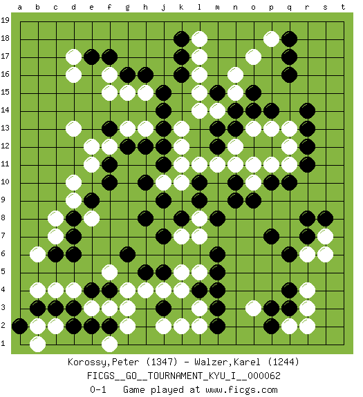 Last move : 0-1 2016 August 12 11:56:56 [Event "FICGS__GO__TOURNAMENT_KYU_I__000062"] [Site "FICGS"] [Date "2016.04.15"] [Round "1"] [Black "Korossy,Peter"] [White "Walzer,Karel"] [Result "0-1"] [Rating 1 "1347"] [Rating 2 "1244"] 1.q16 d4 2.q4 d16 3.q10 d10 4.f17 f16 5.g16 f15 6.e17 d17 7.k16 o3 8.m3 r6 9.q6 r3 10.q3 r4 11.r7 s6 12.p7 o17 13.q17 l17 14.k17 l16 15.r13 k4 16.m5 l3 17.l4 l5 18.m4 k5 19.f10 e8 20.f13 d13 21.c3 c4 22.d3 e3 23.e2 f3 24.f2 k10 25.k8 l8 26.j9 g15 27.h16 g13 28.g12 h13 29.j11 j10 30.h10 k11 31.j12 f12 32.h8 k12 33.j13 k13 34.j14 o13 35.n10 q13 36.r14 l2 37.m2 k2 38.m15 l15 39.o15 n12 40.m13 l14 41.m12 m14 42.n14 m11 43.n13 n11 44.l9 o10 45.n9 q11 46.r11 q12 47.l10 l11 48.p10 p11 49.o9 o11 50.p14 p13 51.r12 l18 52.k18 p18 53.q18 n16 54.g6 g2 55.b3 b4 56.e4 g4 57.f4 g3 58.d6 c7 59.c6 b6 60.d7 c8 61.d8 d9 62.e9 e11 63.f11 e12 64.h12 h15 65.j15 n15 66.o14 q2 67.p2 r2 68.p3 s7 69.r8 l7 70.j3 j2 71.h5 h4 72.j5 j4 73.m6 k7 74.s8 b2 75.a2 c2 76.d2 b1 77.m8 f1 78.j7 f5 0-1 Here are the names of the openings (joseki) played in the four corners : Corner d16 : d16 f17 Hoshi (Hwajeom, Seongjeom, Xingwei`) 4-4 Point. The star or hoshi (4-4) point, emphasizing influence at the potential expense of territory. Ikken Kakari (Hankan Keolch'im, Yi Gua`jiao~, 1-Space Low Approach). Black 2 is the standard approach move to the 4-4. Corner q4 : q4 o3 Hoshi (Hwajeom, Seongjeom, Xingwei`) 4-4 Point. The star or hoshi (4-4) point, emphasizing influence at the potential expense of territory. Ikken Kakari (Hankan Keolch'im, Yi Gua`jiao~, 1-Space Low Approach). White 2 is the standard approach move to the 4-4. Corner q16 : q16 o17 Hoshi (Hwajeom, Seongjeom, Xingwei`) 4-4 Point. The star or hoshi (4-4) point, emphasizing influence at the potential expense of territory. Ikken Kakari (Hankan Keolch'im, Yi Gua`jiao~, 1-Space Low Approach). White 2 is the standard approach move to the 4-4. Player White won this Go (weiqi, baduk) game. Follow this game move after move (download)To emphasize the lack of determination in his moves, one speaks of chance. (Pierre Audouard) Internet: Absolute communication, absolute isolation. (Paul Carvel)