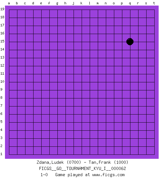 Last move : 1-0 2016 June 26 23:48:48 [Event "FICGS__GO__TOURNAMENT_KYU_I__000062"] [Site "FICGS"] [Date "2016.04.15"] [Round "1"] [Black "Zdana,Ludek"] [White "Tan,Frank"] [Result "1-0"] [Rating 1 "0700"] [Rating 2 "1000"] 1.q15 1-0 This go game has been lost on time (started : 2016.04.15 12:28:27) Here are the names of the openings (joseki) played in the four corners : Player Black won this Go (weiqi, baduk) game. Follow this game move after move (download)There are players who don't accept exchange: they play many moves that perpetuate a previous state of the game. (Pierre Audouard) Only sick music makes money today. (Friedrich Nietzsche)
