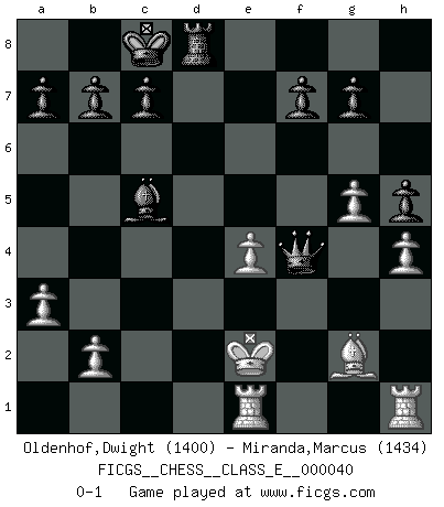 Last move : 0-1 2007 April 9 13:37:40 [Event "FICGS__CHESS__CLASS_E__000040"] [Site "FICGS"] [Date "2007.03.25"] [Round "1"] [White "Oldenhof,Dwight"] [Black "Miranda,Marcus"] [Result "0-1"] [WhiteElo "1400"] [BlackElo "1434"] 1.Nf3 Nf6 2.d4 d5 3.h3 Bf5 4.Nc3 e6 5.a3 Ne4 6.Nxe4 Bxe4 7.Nd2 Bf5 8.g4 Bg6 9.Bg2 Nc6 10.c3 Qd7 11.e4 O-O-O 12.h4 h5 13.g5 dxe4 14.Nxe4 e5 15.Be3 exd4 16.cxd4 Qd5 17.f3 Nxd4 18.Bxd4 Qxd4 19.Qb3 Bxe4 20.fxe4 Qd2+ 21.Kf1 Bc5 22.Qf3 Qc2 23.Re1 Rd2 24.Re2 Qc1+ 25.Re1 Qc4+ 26.Qe2 Rxe2 27.Rxe2 Qc1+ 28.Re1 Qf4+ 29.Ke2 Rd8 0-1 Reti Opening Queenside Castling by player Black (move 11) Player Black won this chess game. Follow this game move after move (download)The passed Pawn is a criminal, who should be kept under lock and key. Mild measures, such as police surveillance, are not sufficient. (Aaron Nimzovich) Der vorletzte Fehler gewinnt. (Savielly Grigorievitsch Tartakower) No soy una persona materialista y por eso, no resiento la falta o pérdida del dinero. La ausencia de cosas mundanas carece de importancia. Ya que el Ajedrez es una forma en la que puedo ser tan materialista como yo desee sin tener la necesidad de vender mi alma. (Jamie Walter Adams) A ce moment-là, je menaçais de comprendre la position ! (Clément L'Heureux) Watch your thoughts; they become words. Watch your words; they become actions. Watch your actions; they become habits. Watch your habits; they become character. Watch your character; it becomes your destiny. (Frank Outlaw)