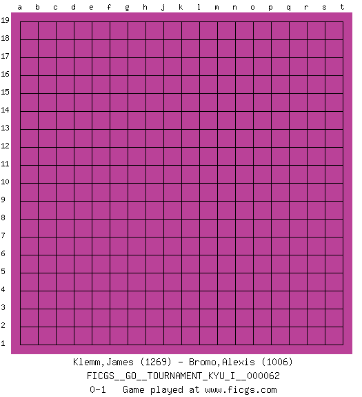 Last move : 0-1 2016 June 26 23:48:48 [Event "FICGS__GO__TOURNAMENT_KYU_I__000062"] [Site "FICGS"] [Date "2016.04.15"] [Round "1"] [Black "Klemm,James"] [White "Bromo,Alexis"] [Result "0-1"] [Rating 1 "1269"] [Rating 2 "1006"] 0-1 This go game has been lost on time (started : 2016.04.15 12:28:27) Here are the names of the openings (joseki) played in the four corners : Player White won this Go (weiqi, baduk) game. Follow this game move after move (download)There is death in the hane. (Anonymous) Every now and then a man's mind is stretched by a new idea and never shrinks back to its former dimensions. (Oliver Wendell Holmes, Sr.)