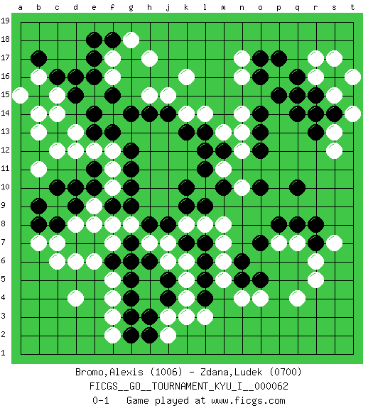Last move : 0-1 2016 September 15 19:42:22 [Event "FICGS__GO__TOURNAMENT_KYU_I__000062"] [Site "FICGS"] [Date "2016.04.15"] [Round "1"] [Black "Bromo,Alexis"] [White "Zdana,Ludek"] [Result "0-1"] [Rating 1 "1006"] [Rating 2 "0700"] 1.q16 d4 2.d16 q4 3.q10 k4 4.d10 k16 5.k10 f17 6.e17 f16 7.e16 n17 8.o17 n16 9.o16 s15 10.s16 p16 11.p15 r16 12.r15 r17 13.p17 s17 14.s14 t16 15.n6 q7 16.r7 r6 17.q8 p7 18.p8 s7 19.r8 r5 20.o7 n4 21.o5 o4 22.n5 r14 23.q15 s13 24.r13 s12 25.q14 t14 26.r14 n13 27.o13 n14 28.o14 c7 29.c8 d8 30.d9 c9 31.b8 c6 32.d7 e8 33.e7 f5 34.g6 f7 35.f6 e6 36.g7 d6 37.g5 f4 38.g4 f3 39.g3 f2 40.g2 g8 41.h8 k6 42.l7 h7 43.h6 j7 44.j8 j6 45.j5 k5 46.j4 j3 47.h3 j2 48.h2 k3 49.g9 f8 50.f9 e9 51.e10 c12 52.c10 c15 53.d15 c14 54.c16 f14 55.e14 d13 56.e13 e12 57.f13 b13 58.b15 b14 59.f18 g18 60.e18 h17 61.g14 b16 62.b17 a15 63.f15 h15 64.h14 j15 65.j14 k14 66.k13 l14 67.l13 m13 68.m12 n12 69.o12 m11 70.l12 n10 71.o10 l10 72.l11 k8 73.k9 f10 74.g10 f11 75.g11 b7 76.b9 b11 77.e11 f12 78.g12 d12 79.k7 l8 80.l9 m8 81.m10 m7 82.l6 m6 83.l5 m5 84.l4 l3 0-1 Here are the names of the openings (joseki) played in the four corners : Corner d16 : d16 f17 Hoshi (Hwajeom, Seongjeom, Xingwei`) 4-4 Point. The star or hoshi (4-4) point, emphasizing influence at the potential expense of territory. Ikken Kakari (Hankan Keolch'im, Yi Gua`jiao~, 1-Space Low Approach). White 2 is the standard approach move to the 4-4. Corner q16 : q16 n17 Hoshi (Hwajeom, Seongjeom, Xingwei`) 4-4 Point. The star or hoshi (4-4) point, emphasizing influence at the potential expense of territory. Niken Kakari (Dukan Keolch'im, E`r Gua`jiao~, 2-Space Low Approach). Black typically answers by 7-3 or 3-5 (which is not joseki). Corner q4 : q4 n6 Hoshi (Hwajeom, Seongjeom, Xingwei`) 4-4 Point. The star or hoshi (4-4) point, emphasizing influence at the potential expense of territory. Player White won this Go (weiqi, baduk) game. Follow this game move after move (download)Keep away from thickness. (Anonymous) It's not enough to succeed. Others must fail. (Gore Vidal)