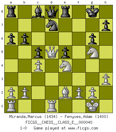 Last move : 1-0 2007 April 25 16:55:32 [Event "FICGS__CHESS__CLASS_E__000040"] [Site "FICGS"] [Date "2007.03.25"] [Round "1"] [White "Miranda,Marcus"] [Black "Fenyves,Adam"] [Result "1-0"] [WhiteElo "1434"] [BlackElo "1400"] 1.d4 Nf6 2.c4 g6 3.Nc3 Bg7 4.e4 d6 5.Nf3 O-O 6.Be2 c5 7.d5 e6 8.O-O Nbd7 9.dxe6 fxe6 10.Qxd6 Re8 11.Rd1 a6 12.h3 b6 13.e5 Nh5 14.Bg5 Nhf6 15.exf6 Bxf6 16.Ne4 Bxg5 17.Nfxg5 e5 18.Qd5+ 1-0 King's Indian : 6.Be2 Kingside Castling by player Black (move 5) Kingside Castling by player White (move 8) Player White won this chess game. Follow this game move after move (download)A strong memory, concentration, imagination, and a strong will is required to become a great Chess player. (Bobby Fischer) Frage: Was machen Sie mit den Preisen? Anwort: Ich habe Angst, dass meine Freundin davon neue Kleider kauft. (Loek van Wely) Aunque la mayoría de la gente disfruta observar las partidas de los grandes Maestros de ataque, algunos de los jugadores mas notables en la historia han sido los jugadores silenciosos posicionales. Lentamente ellos te aplastan despojandote de tu espacio, congestionando tus piezas y dejandote virtualmente sin nada que hacer. (Yasser Seirawan) Les Echecs mettent en conflit, non pas deux intelligences, mais deux volontés. (Lasker) When you don't know what to do, walk fast and look worried. (Anonymous)