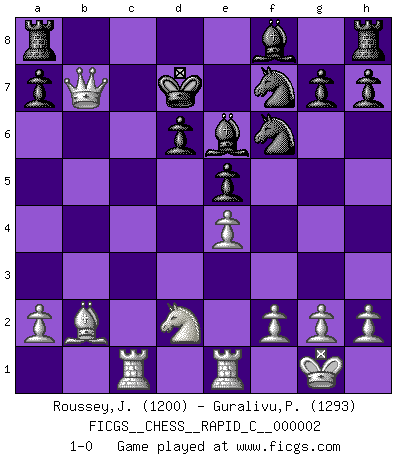Last move : 1-0 2006 June 16 15:4:12 [Event "FICGS__CHESS__RAPID_C__000002"] [Site "FICGS"] [Date "2006.05.31"] [Round "1"] [White "Roussey,Jacques"] [Black "Guralivu,Paul-Iosif"] [Result "1-0"] [WhiteElo "1200"] [BlackElo "1293"] 1.e4 c5 2.Nf3 Nc6 3.d4 cxd4 4.c3 dxc3 5.Bc4 cxb2 6.Bxb2 d6 7.O-O Bg4 8.Nbd2 Nf6 9.Re1 e5 10.Qb3 Qc7 11.Ng5 Nd8 12.Rac1 Qd7 13.Nxf7 Nxf7 14.Bb5 Be6 15.Bxd7+ Kxd7 16.Qxb7+ 1-0 Sicilian defense Kingside Castling by player White (move 7) Player White won this chess game. Follow this game move after move (download)Fischer prefers to enter Chess history alone. (Miguel Najdorf) Wenn es im Universum noch irgendwo intelligente Lebewesen gibt, dann kennen sie Go. (Emanuel Lasker) Personalmente, yo prefiero mirar hacia el futuro en donde un programa de computadora gane el título mundial de Ajedrez. La humanidad necesita una lección de humildad. (Richard Dawkings) Une platitude souvent récitée à propos des Echecs est qu'une des choses les plus difficiles à réaliser est de gagner une position gagnante. Cela ne manque pas de sens mais, pour ma part, j'ai toujours trouvé plus difficile de gagner une position perdante. (Tim Krabbe) Everything in life is luck. (Donald Trump)
