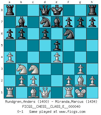 Last move : 0-1 2007 June 18 20:4:13 [Event "FICGS__CHESS__CLASS_E__000040"] [Site "FICGS"] [Date "2007.03.25"] [Round "1"] [White "Rundgren,Anders"] [Black "Miranda,Marcus"] [Result "0-1"] [WhiteElo "1400"] [BlackElo "1434"] 1.e4 c5 2.Nf3 d6 3.d4 cxd4 4.Nxd4 Nf6 5.Nc3 a6 6.g3 e5 7.Nb3 Nbd7 8.a4 Be7 9.Bg2 b6 10.O-O Bb7 0-1 This chess game has been lost on time (started : 2007.03.25 14:36:34) Sicilian : Najdorf, Zagreb (Fianchetto) variation Kingside Castling by player White (move 10) Player Black won this chess game. Follow this game move after move (download)Whoever sees no other aim in the game than that of giving checkmate to one's opponent will never become a good Chess player. (Euwe) Wenn ich Weiß habe gewinne ich weil ich Weiß habe, wenn ich Schwarz habe gewinne ich weil ich Bogoljubov bin. (Efim Bogoljubov) Si no le temes a Spassky, entonces elimino el elemento del dinero. (Jim Slater) Echiquier : carré parfait, comme la Jérusalem nouvelle décrite par l'auteur de l'Apocalypse, huit cases sur huit, exaltation du chiffre 4, symbole du cosmos aux quatre horizons... où le noir et le blanc, l'ombre et la lumière, le mal et le bien s'entremêlent et se conjuguent. (Robert Couffignal, Le Gambit du poète) Inventor: A person who makes an ingenious arrangement of wheels, levers and springs, and believes it civilization. (Ambrose Bierce, The Devil's Dictionary)