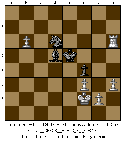 Last move : 1-0 2016 August 16 7:57:56 [Event "FICGS__CHESS__RAPID_E__000172"] [Site "FICGS"] [Date "2016.04.17"] [Round "1"] [White "Bromo,Alexis"] [Black "Stoyanov,Zdravko"] [Result "1-0"] [WhiteElo "1088"] [BlackElo "1155"] 1.d4 d5 2.c4 dxc4 3.Nc3 h6 4.e4 a6 5.Bxc4 e6 6.a3 b5 7.Bb3 Bd7 8.Nf3 a5 9.O-O a4 10.Ba2 b4 11.axb4 Bxb4 12.Bd2 a3 13.b3 Nc6 14.d5 exd5 15.exd5 Nce7 16.Re1 Nf6 17.h3 O-O 18.Qc2 Bf5 19.Ne4 Nxe4 20.Bxb4 Nd6 21.Qc1 Nxd5 22.Bxa3 Re8 23.Bb2 Nb4 24.Rxe8+ Qxe8 25.Qxc7 Ne4 26.Nd4 Bg6 27.Qb7 Nxa2 28.Ne6 Nd6 29.Nxg7 Nxb7 30.Nxe8 Rxe8 31.Rxa2 Nc5 32.b4 Nd3 33.Bc3 Re1+ 34.Bxe1 Nxe1 35.b5 Nd3 36.b6 Nc5 37.Ra5 Nb7 38.Ra7 Be4 39.Ra8+ Kg7 40.Re8 Bc6 41.Rc8 Bd5 42.f3 Kf6 43.Kf2 Ke5 44.Ke3 f5 45.Rh8 Nd6 46.Rxh6 f4+ 47.Kf2 1-0 This chess game has been lost on time (started : 2016.04.17 10:14:7) Queen's gambit accepted Kingside Castling by player White (move 9) Kingside Castling by player Black (move 17) 10 pieces endgame at move 46 : White KRPPPP , Black KBNP WHITE : King + 1 Rook 4 Pawns BLACK : King + 1 Bishop 1 Knight 1 Pawn Player White won this chess game. Follow this game move after move (download)The hardest game to win is a won game. (Emanuel Lasker) Privat ist Kortschnoi kein schlechter Mensch, sehr sympathisch. Aber während des Spiels ist er grausam. Er will dich töten. (Miguel Najdorf) Las piezas de Ajedrez son los bloques del alfabeto que moldean los pensamientos; y esos pensamientos, aunque hagan un diseño visual en el tablero, expresan abstractamente su belleza como un poema. (Marcel Duchamp) Aux échecs, l'amour-propre est satisfait quand on remporte la victoire, mais il n'y a pas de honte à être battu. (Benjamin Franklin) Panic is a sudden desertion of us, an a going over to the enemy of our imagination. (Christian Nevell Bovee)