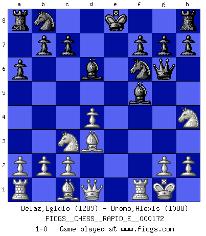 Last move : 1-0 2016 June 2 19:36:19 [Event "FICGS__CHESS__RAPID_E__000172"] [Site "FICGS"] [Date "2016.04.17"] [Round "1"] [White "Belaz,Egidio"] [Black "Bromo,Alexis"] [Result "1-0"] [WhiteElo "1289"] [BlackElo "1088"] 1.e4 e5 2.f4 d6 3.Nf3 a6 4.fxe5 dxe5 5.Nxe5 Qe7 6.Nf3 Qxe4+ 7.Be2 Nf6 8.O-O Bc5+ 9.d4 Bd6 10.Nc3 Qg6 11.Bd3 Bf5 12.Nh4 1-0 King's gambit Kingside Castling by player White (move 8) Player White won this chess game. Follow this game move after move (download)The isolated Pawn casts gloom over the entire chessboard. (Aaron Nimzovich) Du kannst im Schach nur gut werden, wenn du das Spiel liebst. (Robert James Fischer) Fischer era un maestro de claridad y un Rey del posicionamiento astuto. Sus oponentes podían ver hacia donde se dirigía pero eran impotentes para detenerlo. (Bruce Pandolfini) Il n'y a pas eu de défaite parce que je ne crois pas que cet ordinateur ait jamais existé. IBM a triché en refusant d'imprimer les modes de recherche de la machine. C'est évident, pendant le match, des coups décisifs ont été joués par des êtres humains. Aujourd'hui, les meilleurs spécialistes en informatique ne peuvent toujours pas expliquer comment Deep-Blue a pu jouer contre la logique des ordinateurs. IBM a gagné une guerre de communication, mais ils sont incapables de prouver que l'ordinateur a gagné tout seul. (Garry Kasparov) If you ain't just a little scared when you enter a casino, you are either very rich or you haven't studied the games enough. (Pappy)