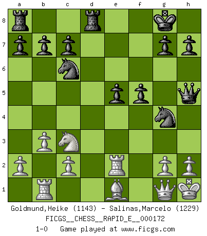 Last move : 1-0 2016 August 6 18:14:10 [Event "FICGS__CHESS__RAPID_E__000172"] [Site "FICGS"] [Date "2016.04.17"] [Round "1"] [White "Goldmund,Heike"] [Black "Salinas,Marcelo"] [Result "1-0"] [WhiteElo "1143"] [BlackElo "1229"] 1.e4 e6 2.d4 d5 3.exd5 Qxd5 4.Nc3 Bb4 5.Nge2 Nf6 6.Bd2 Bxc3 7.Nxc3 Qxd4 8.Be3 Qb4 9.Rb1 e5 10.Be2 O-O 11.O-O Bg4 12.Bxg4 Nxg4 13.Bd2 Qc4 14.Re1 f5 15.b3 Qc5 16.Na4 Qxf2+ 17.Kh1 Rd8 18.Re2 Qh4 19.Qg1 Nc6 20.Be1 Qh5 21.Nc3 1-0 This chess game has been lost on time (started : 2016.04.17 10:14:7) French : Exchange variation Kingside Castling by player Black (move 10) Kingside Castling by player White (move 11) Player White won this chess game. Follow this game move after move (download)Fischer wanted to give the Russians a taste of their own medicine. (Larry Evans) Mit Schach schule ich mein Gefühl für Geometrie, was für Tennis und Schach gleichermaßen wichtig ist. (Boris Becker) Un mal plan es mejor que no tener ningún plan. (Frank Marshall) La guerre est enfant de la passion, la passion est enfant du narcissisme et le narcissisme est l'enfant. (...) Une autre partie ? (Thibault de Vassal) Waiting for chance ? Play in casinos. (FICGS proverb)