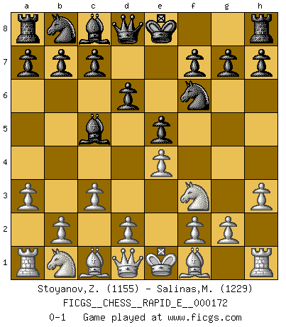 Last move : 0-1 2016 July 15 13:48:4 [Event "FICGS__CHESS__RAPID_E__000172"] [Site "FICGS"] [Date "2016.04.17"] [Round "1"] [White "Stoyanov,Zdravko"] [Black "Salinas,Marcelo"] [Result "0-1"] [WhiteElo "1155"] [BlackElo "1229"] 1.e4 e6 2.Nf3 Bc5 3.h3 d6 4.a3 e5 5.c3 Nf6 0-1 This chess game has been lost on time (started : 2016.04.17 10:14:7) French defense Player Black won this chess game. Follow this game move after move (download)Adequate compensation for a sacrifice is having a sound combination leading to a winning position; adequate compensation for a blunder is having your opponent snatch defeat from the jaws of victory. (Bruce A. Moon) Die Arbeit ist etwas Unnatürliches. Die Faulheit allein ist göttlich. (Anatole France) El Ajedrez es parte de una cultura y si una cultura esta en decadencia, entonces también el Ajedrez declinará. (Mikhail Botvinnik) Dieu déplace le joueur, et celui-ci la pièce. Quel Dieu derrière Dieu commence donc la trame ? Arturo Perez-Reverte (prix de littérature policière 1993). First of all, we have to go back to the classical time control. (Anatoly Karpov)