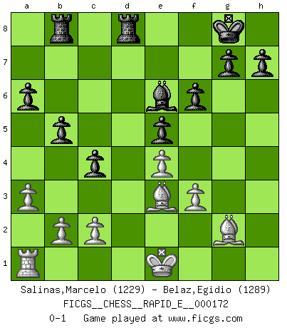 Last move : 0-1 2016 September 2 19:28:1 [Event "FICGS__CHESS__RAPID_E__000172"] [Site "FICGS"] [Date "2016.04.17"] [Round "1"] [White "Salinas,Marcelo"] [Black "Belaz,Egidio"] [Result "0-1"] [WhiteElo "1229"] [BlackElo "1289"] 1.e3 e6 2.Nc3 Nf6 3.Qf3 Nc6 4.a3 Ne5 5.Qf4 Bd6 6.Qa4 O-O 7.Ne4 Nxe4 8.Qxe4 Ng6 9.Nf3 Be7 10.g4 d5 11.Qd4 c5 12.Qc3 c4 13.d3 b5 14.Nd4 a6 15.Nc6 Qd7 16.Nxe7+ Qxe7 17.dxc4 dxc4 18.Bg2 Rb8 19.h4 Nxh4 20.Rh2 e5 21.e4 Bxg4 22.Qg3 Qf6 23.Qxh4 Qxh4 24.Rxh4 Be6 25.Rg4 Bxg4 26.Bg5 f6 27.Be3 Rfd8 28.f3 Be6 0-1 Van't Kruijs Opening Kingside Castling by player Black (move 6) Player Black won this chess game. Follow this game move after move (download)There is only one thing Fischer does in Chess without pleasure: to lose ! (Boris Spassky) Der Partner hat auch seine Existenzberechtigung. (Savielly Grigorievitsch Tartakower) El Ajedrez es un mar en el cual un mosquito puede beber y un elefante puede bañarse. (Refrán Hindú) Ne tendez aucun piège pour le plaisir ! Ne jouez rien dans l'espoir que l'adversaire réagisse de façon stupide ! Prenez toujours pour acquis que l'adversaire va trouver le meilleur coup ! Ne jouez jamais de coup dans l'espoir que l'adversaire ne voie pas la menace ! Chacun de vos coups doit améliorer la position d'une façon ou d'une autre. Some people are so afraid to die that they never begin to live. (Henry Van Dyke)