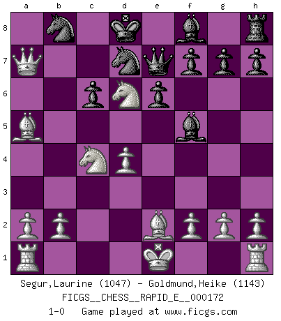 Last move : 1-0 2016 June 12 8:58:55 [Event "FICGS__CHESS__RAPID_E__000172"] [Site "FICGS"] [Date "2016.04.17"] [Round "1"] [White "Segur,Laurine"] [Black "Goldmund,Heike"] [Result "1-0"] [WhiteElo "1047"] [BlackElo "1143"] 1.e4 d5 2.exd5 Qxd5 3.Nc3 Qa5 4.d4 Nf6 5.Nf3 Bf5 6.Ne5 e6 7.Nc4 Qb4 8.Bd2 Qe7 9.Qf3 Bxc2 10.Qxb7 Qb4 11.Qxa8 Nfd7 12.Qxa7 c6 13.Be2 Bf5 14.Ne4 Qe7 15.Ned6+ Kd8 16.Ba5+ 1-0 Scandinavian defense Player White won this chess game. Follow this game move after move (download)It began to feel as though you were playing against Chess itself. - On playing against Robert Fischer. (Walter Shipman) Ein typischer, sehr verbreiteter Gedankenschädling ist der, daß der betreffende Amateur von der Annanhme ausgeht, daß jeder einzelne Zug etwas zu leisten habe. (Aaron Nimzowitsch) Cuando me preguntan: -¿Cual es el secreto que te hace hacer mejores movidas que tus oponentes?, Yo respondo: Me da gusto que me pregunten eso, porque, como veran, hay una simple razón. Yo pienso mis propias movidas y dejo a mi oponente que el piense las suyas. (Alexander Alekhine) La solitude du joueur d'Echecs à l'approche du mat est semblable à celle du condamné. (Francis Szpiner) When you've done things right people won't know you've done anything at all. (Futurama)